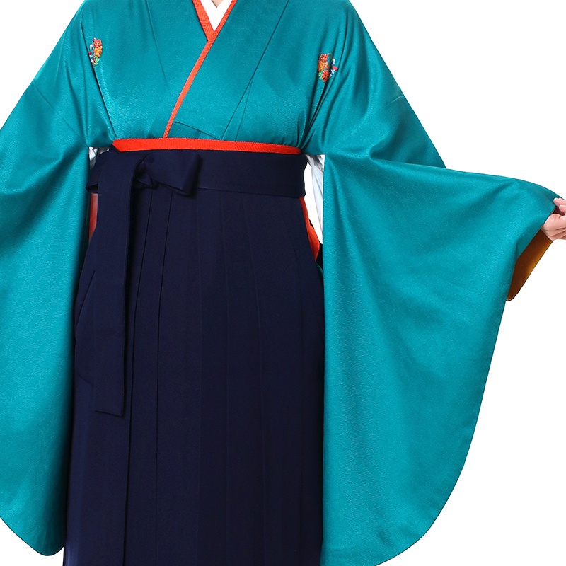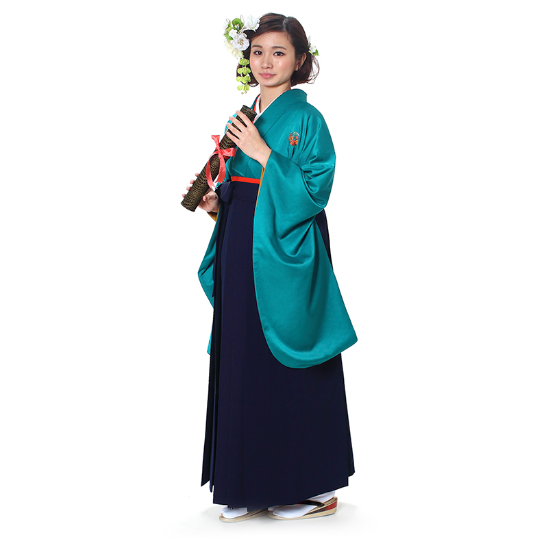 女の子の卒業式のお祝いにぴったりのレンタル着物と袴セットです。シンプルなテイストでグリーン無地|花紋のお着物となります。