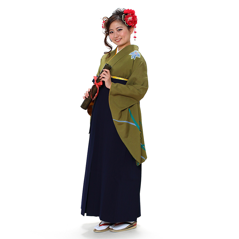 女の子の卒業式のお祝いにぴったりのレンタル着物と袴セットです。日本の伝統柄のテイストでグリーン花柄のお着物となります。