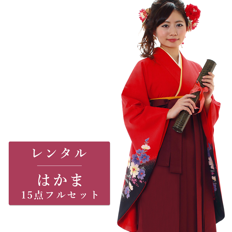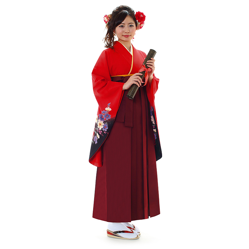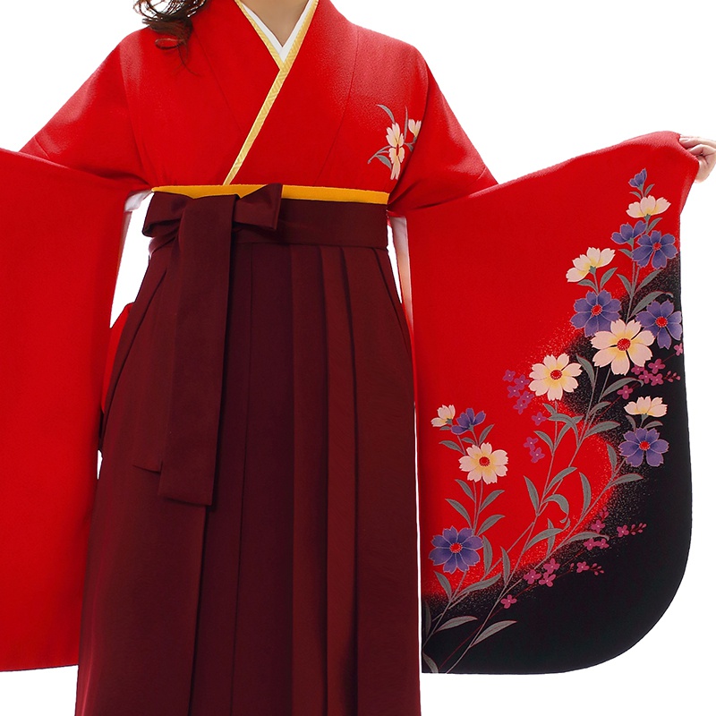 女の子の卒業式のお祝いにぴったりのレンタル着物と袴セットです。日本の伝統柄のテイストでレッド花柄のお着物となります。
