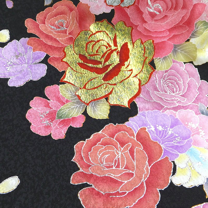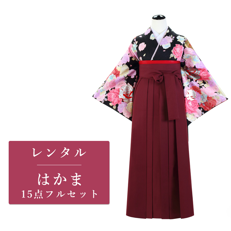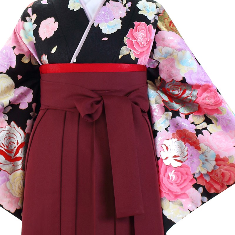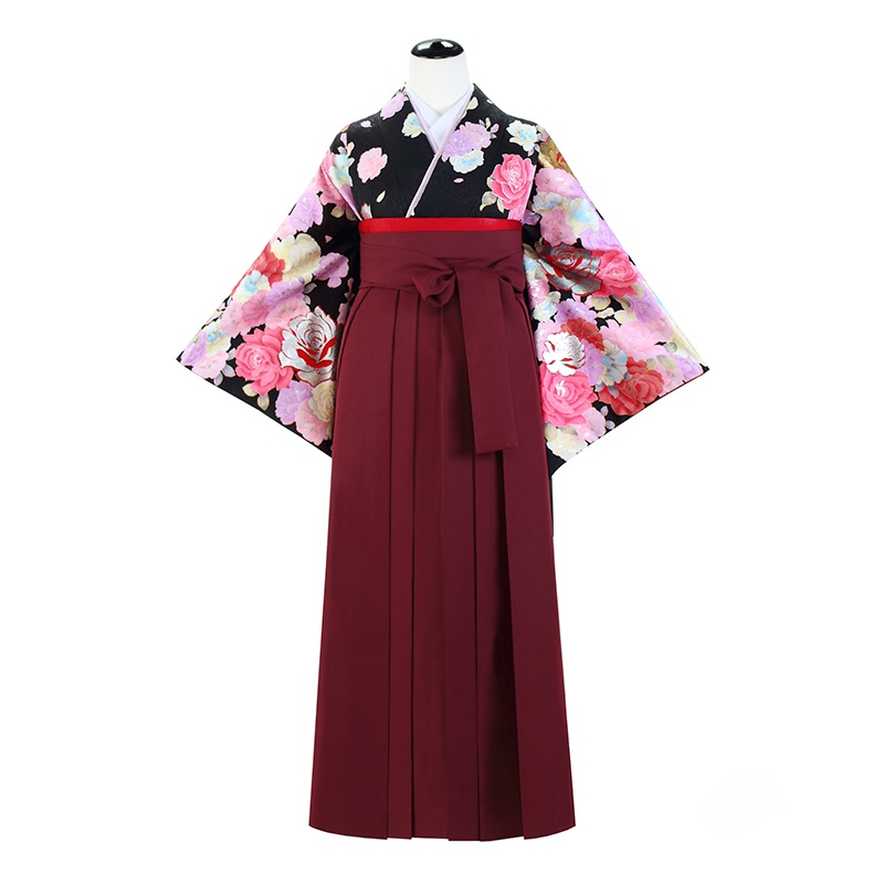 女の子の卒業式のお祝いにぴったりのレンタル着物と袴セットです。日本の伝統柄のテイストでブラック薔薇|花柄のお着物となります。