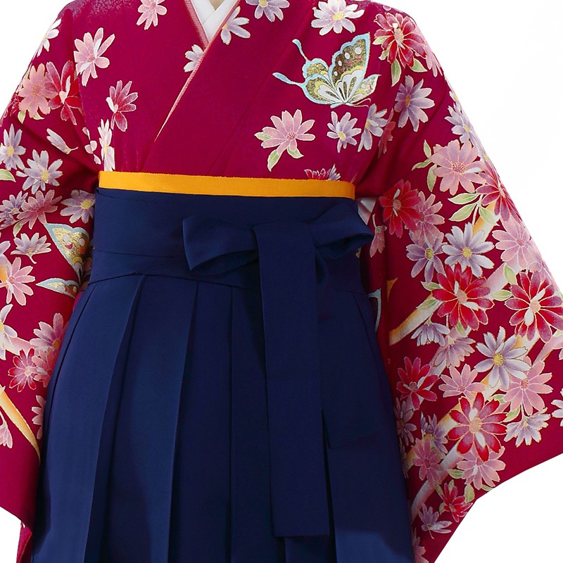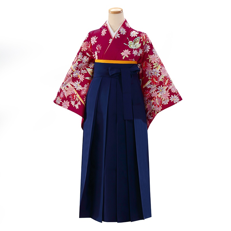 女の子の卒業式のお祝いにぴったりのレンタル着物と袴セットです。日本の伝統柄のテイストでレッド花柄|蝶のお着物となります。