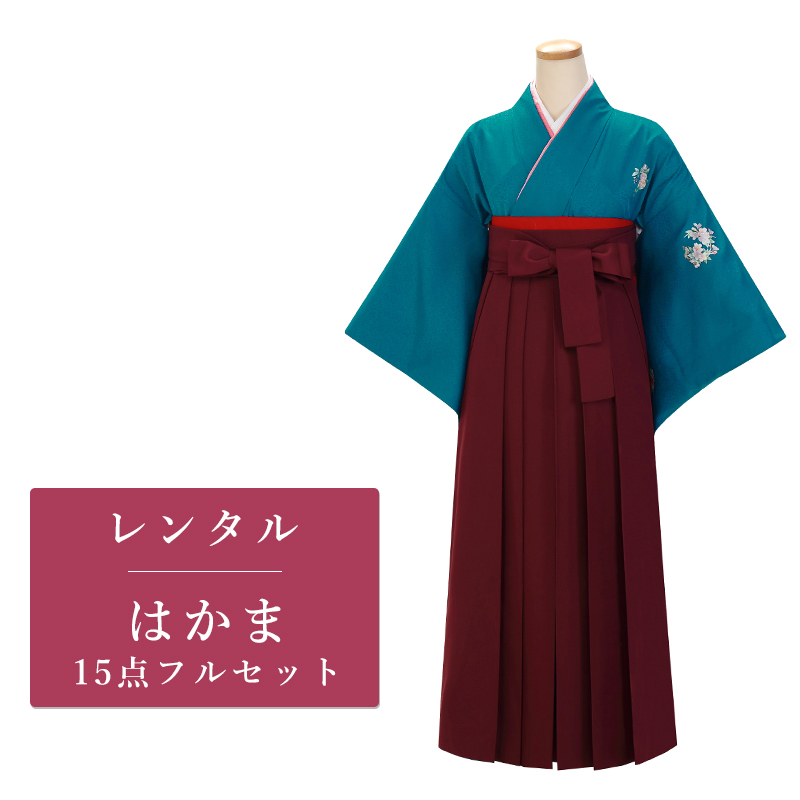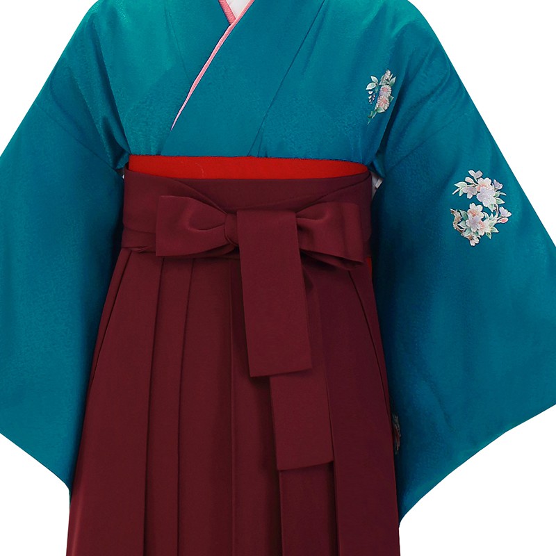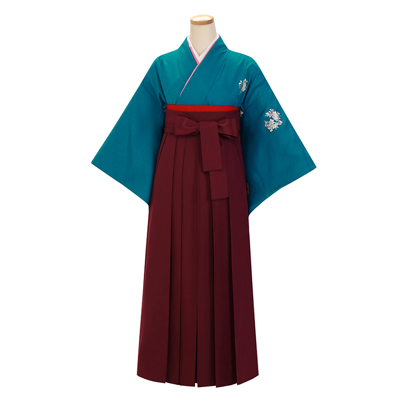女の子の卒業式のお祝いにぴったりのレンタル着物と袴セットです。シンプルなテイストでブルー無地|花紋のお着物となります。