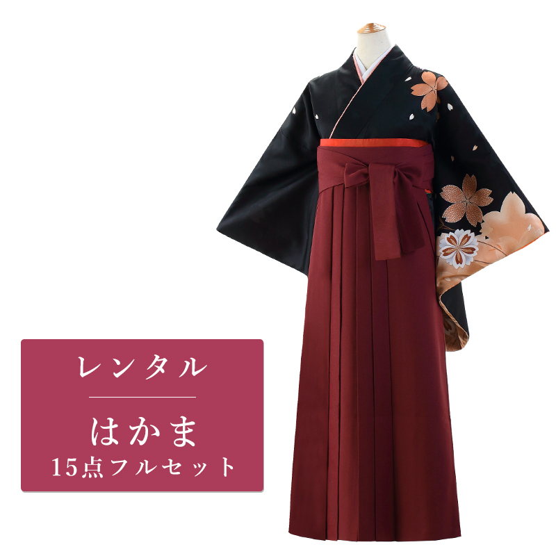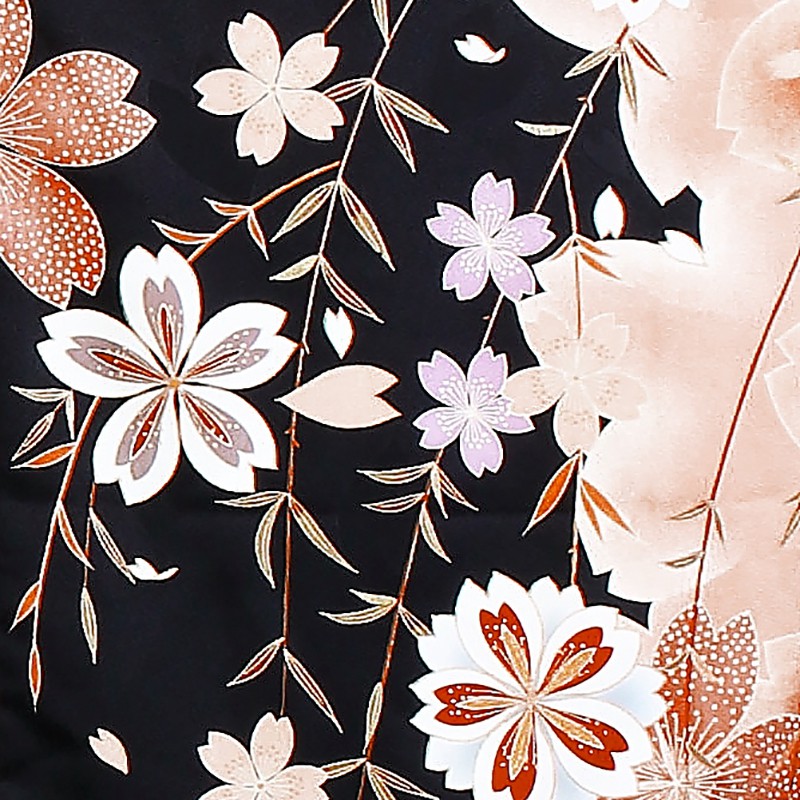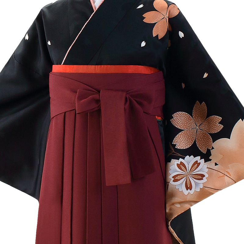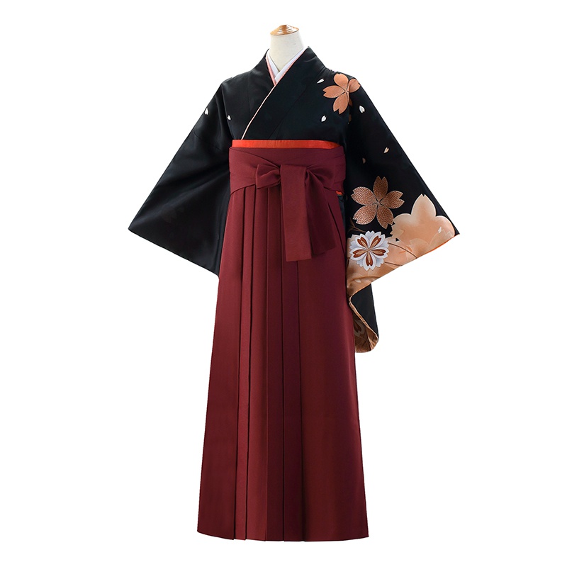 女の子の卒業式のお祝いにぴったりのレンタル着物と袴セットです。日本の伝統柄のテイストでブラック桜|花柄のお着物となります。