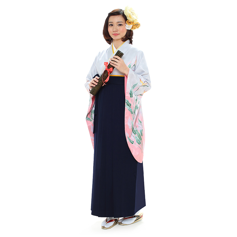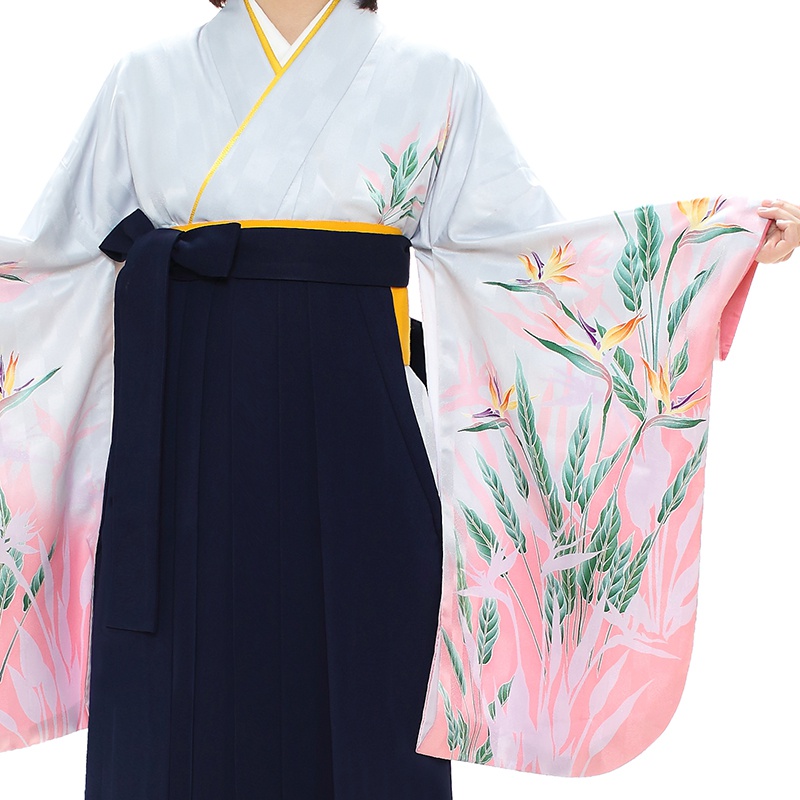 女の子の卒業式のお祝いにぴったりのレンタル着物と袴セットです。日本の伝統柄のテイストでグレー花柄のお着物となります。