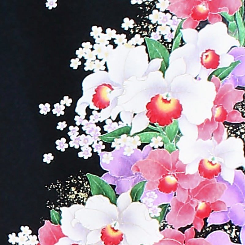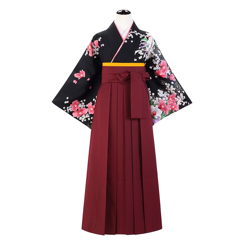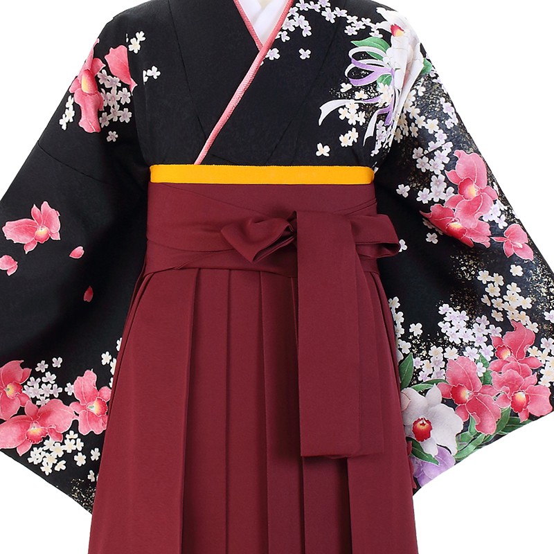 女の子の卒業式のお祝いにぴったりのレンタル着物と袴セットです。日本の伝統柄のテイストでブラックカトレア|花柄のお着物となります。
