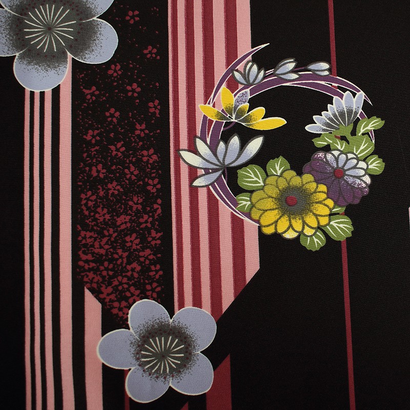 女の子の卒業式のお祝いにぴったりのレンタル着物と袴セットです。日本の伝統柄のテイストでブラック花柄|矢羽根のお着物となります。