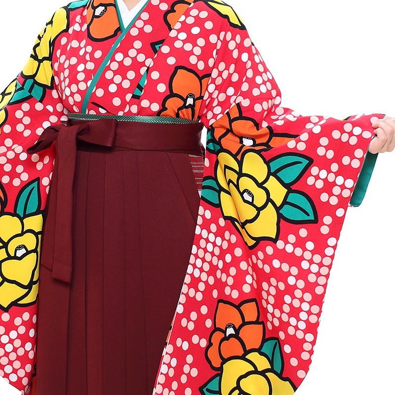 女の子の卒業式のお祝いにぴったりのレンタル着物と袴セットです。おしゃれなデザインが特徴でレッド薔薇|ドット|花柄のお着物となります。