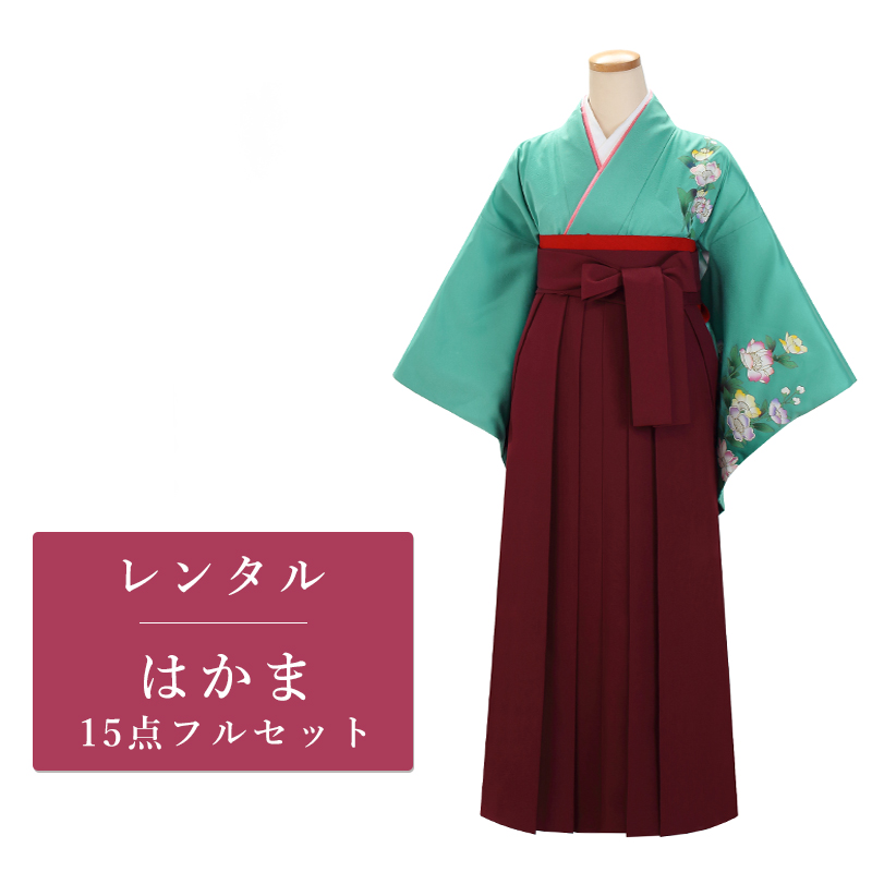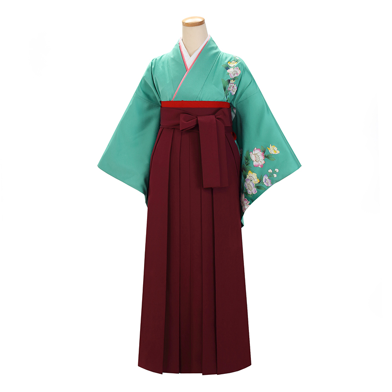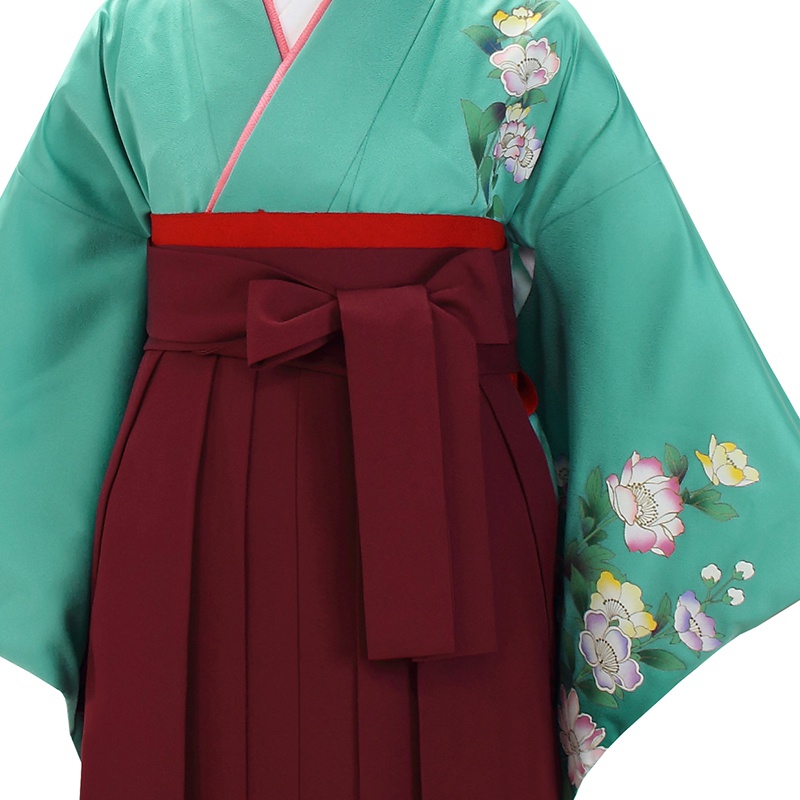 女の子の卒業式のお祝いにぴったりのレンタル着物と袴セットです。日本の伝統柄のテイストでグリーン牡丹|百合|花柄のお着物となります。