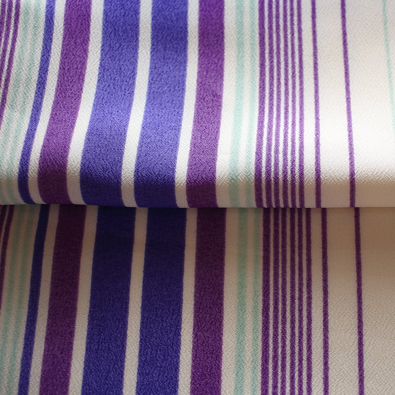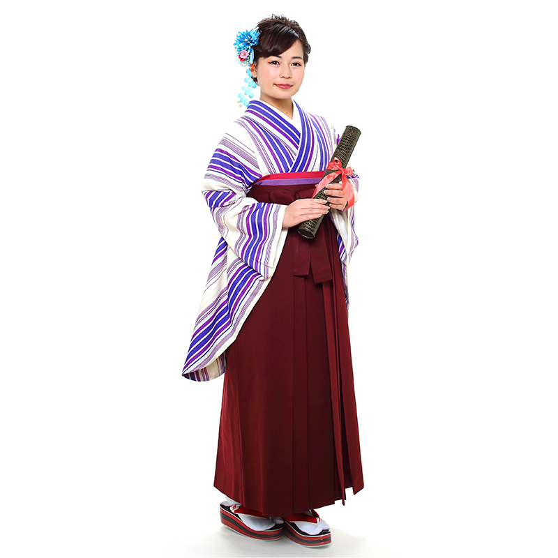 女の子の卒業式のお祝いにぴったりのレンタル着物と袴セットです。おしゃれなデザインが特徴でパープルストライプのお着物となります。