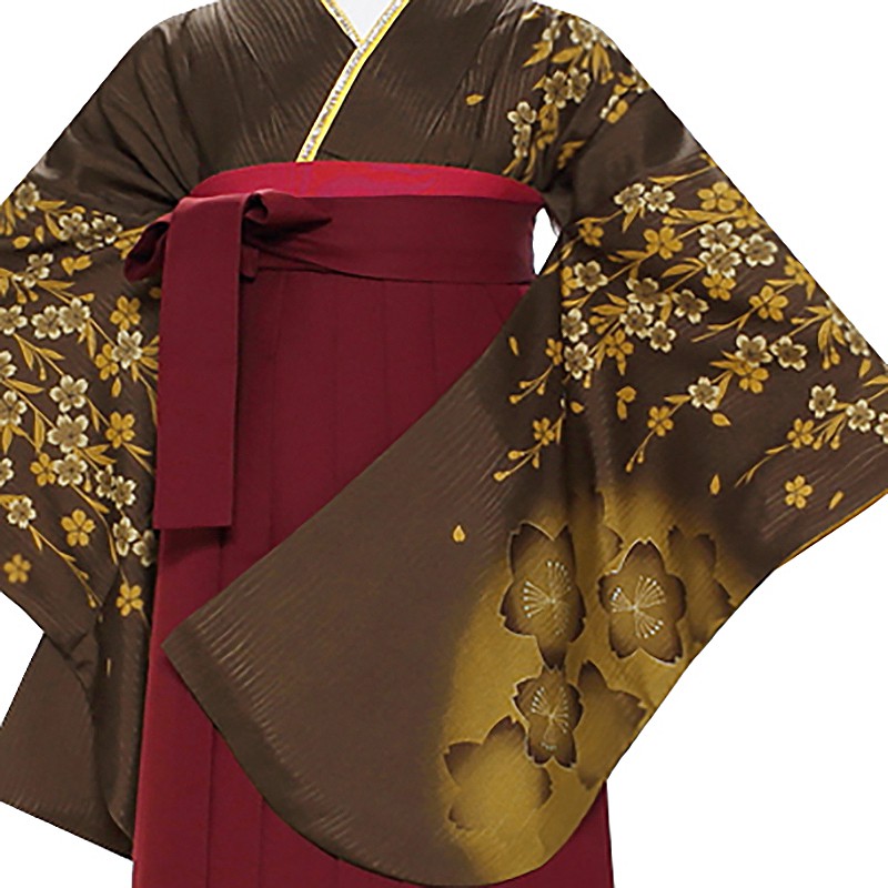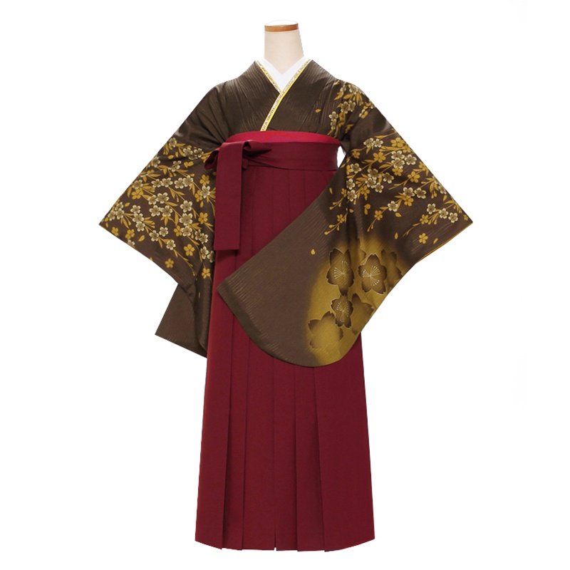 女の子の卒業式のお祝いにぴったりのレンタル着物と袴セットです。日本の伝統柄のテイストでブラウン桜|花柄のお着物となります。