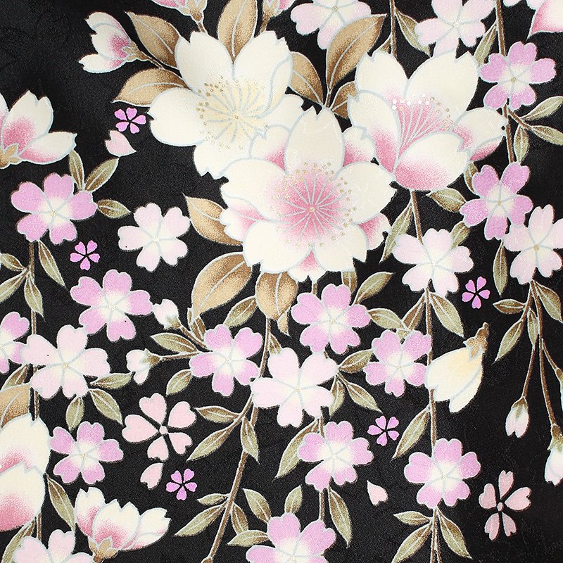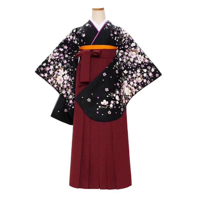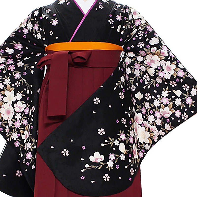 女の子の卒業式のお祝いにぴったりのレンタル着物と袴セットです。日本の伝統柄のテイストでブラック桜|花柄のお着物となります。