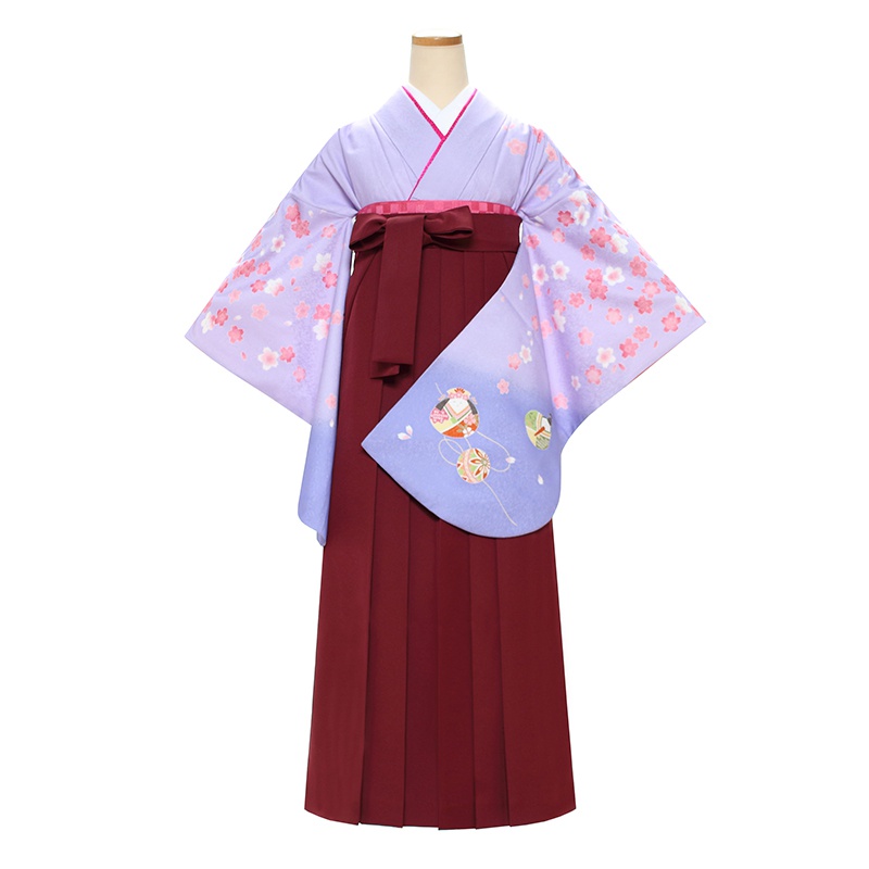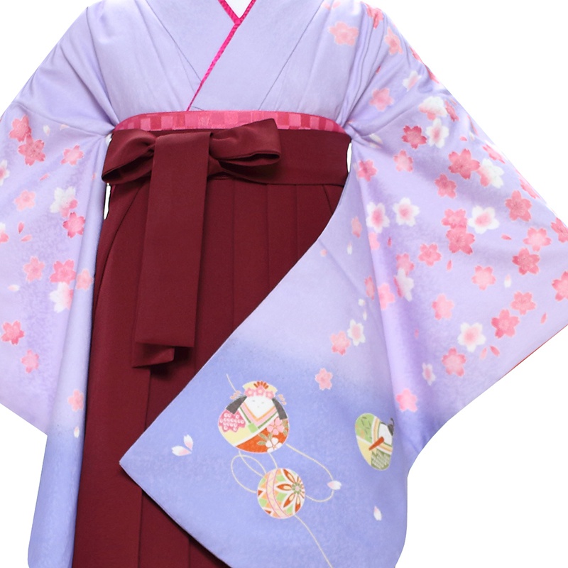 女の子の卒業式のお祝いにぴったりのレンタル着物と袴セットです。日本の伝統柄のテイストでパープル桜|雛人形|古典柄|花柄のお着物となります。