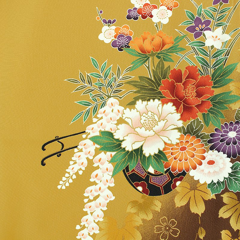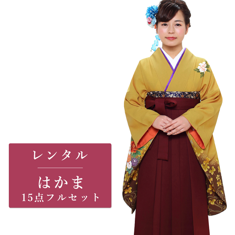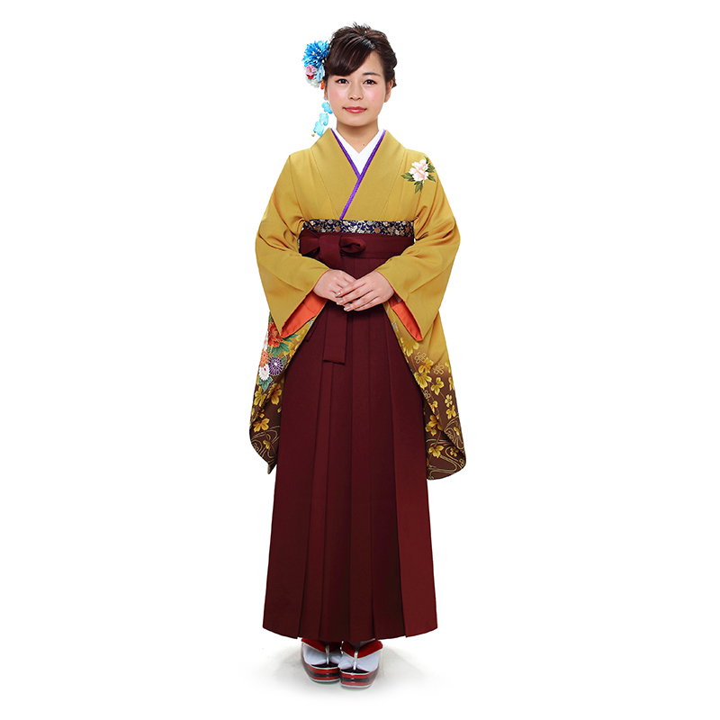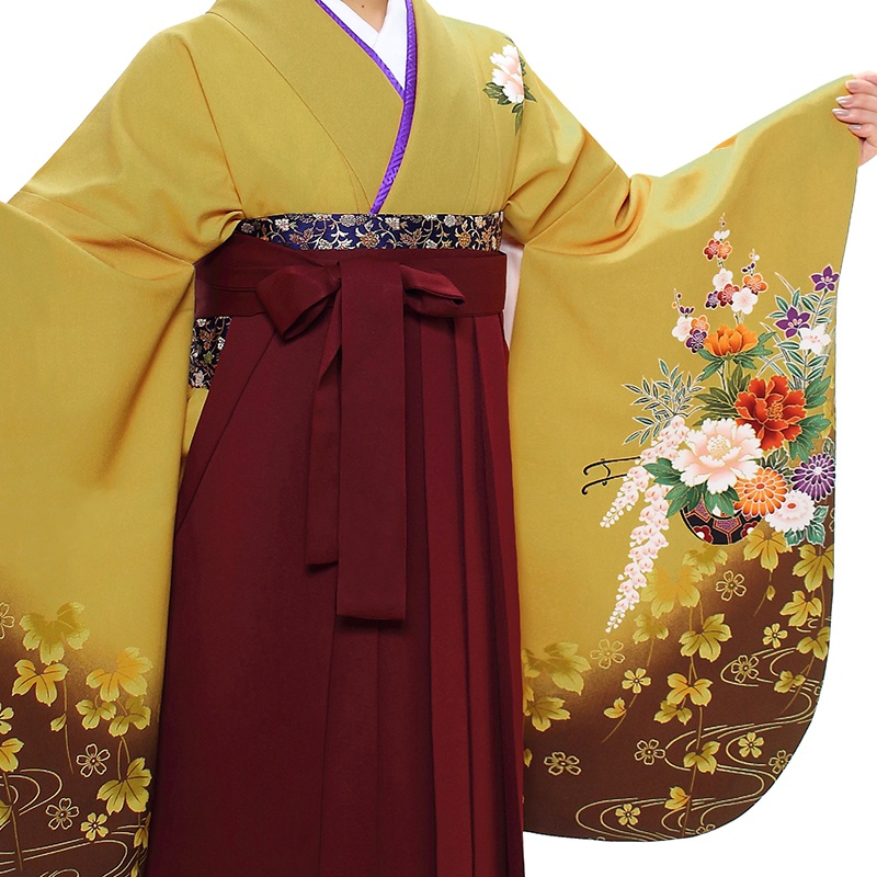 女の子の卒業式のお祝いにぴったりのレンタル着物と袴セットです。日本の伝統柄のテイストでイエロー|ブラウン花車|流水|古典柄のお着物となります。