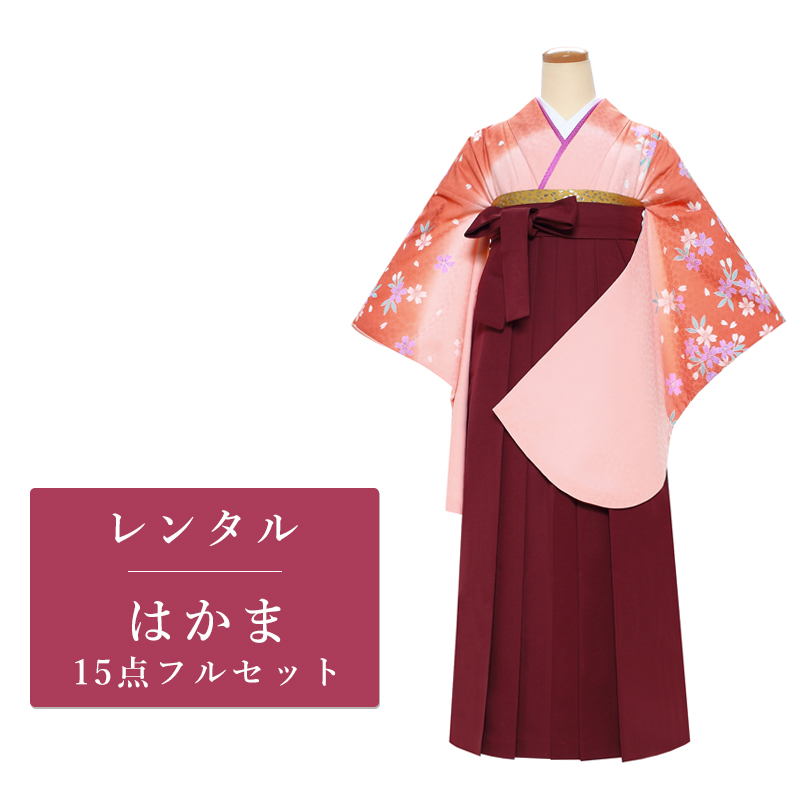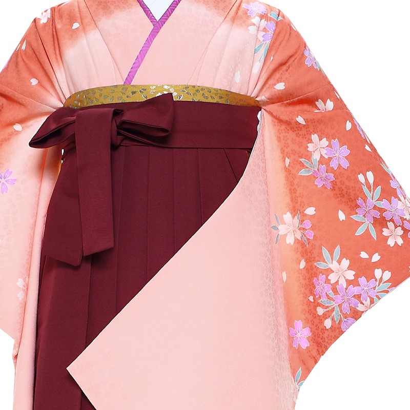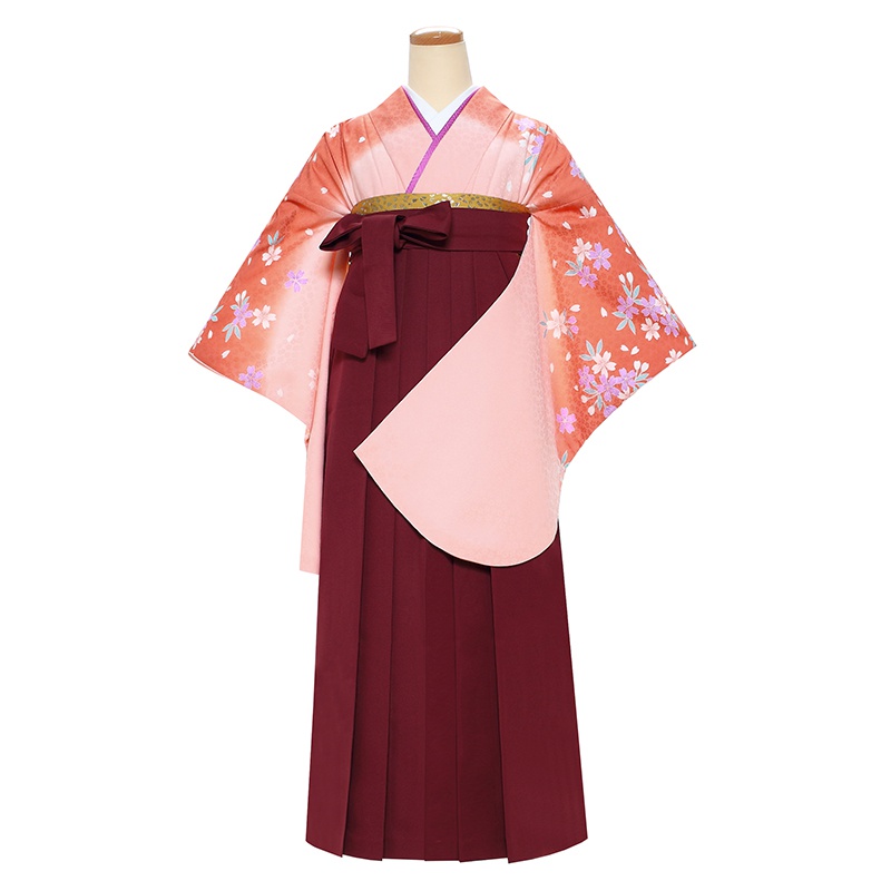 女の子の卒業式のお祝いにぴったりのレンタル着物と袴セットです。日本の伝統柄のテイストでピンク桜|花柄のお着物となります。