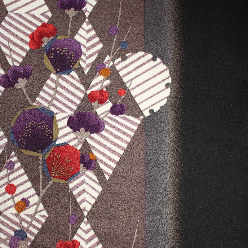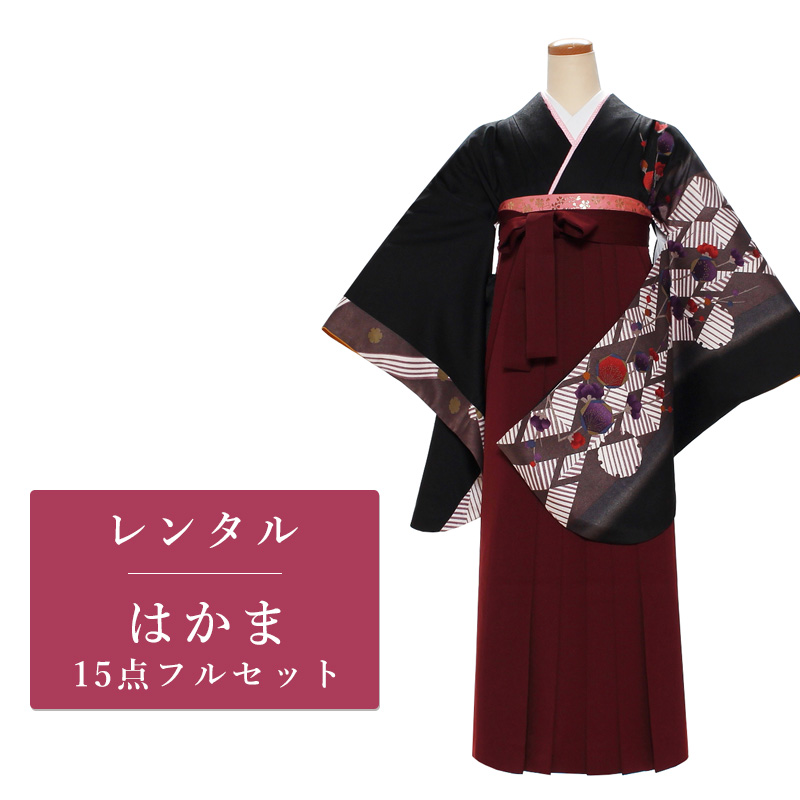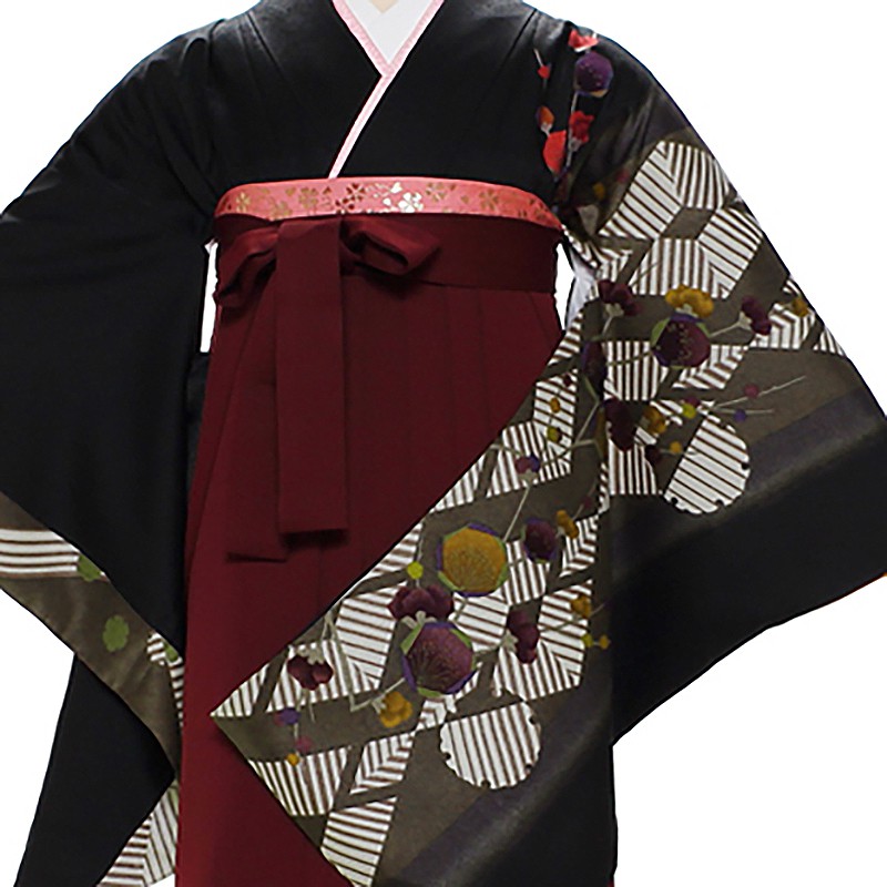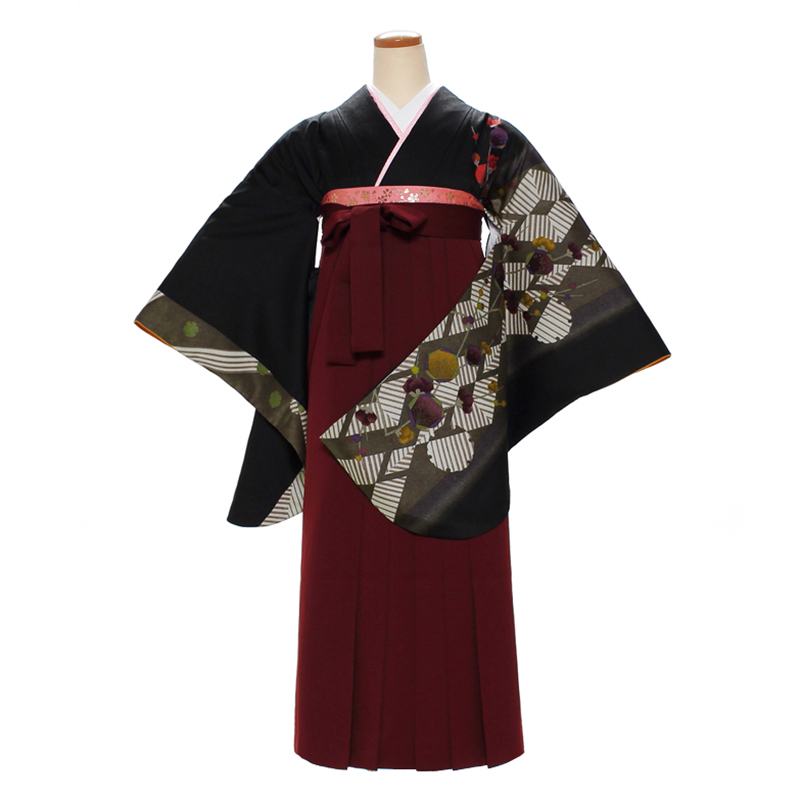 女の子の卒業式のお祝いにぴったりのレンタル着物と袴セットです。日本の伝統柄のテイストでブラック梅|花柄|幾何学のお着物となります。