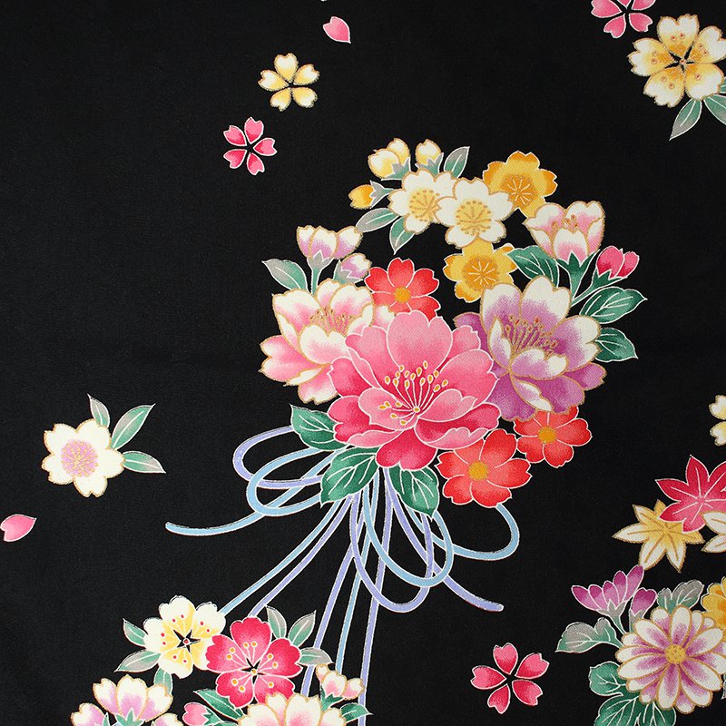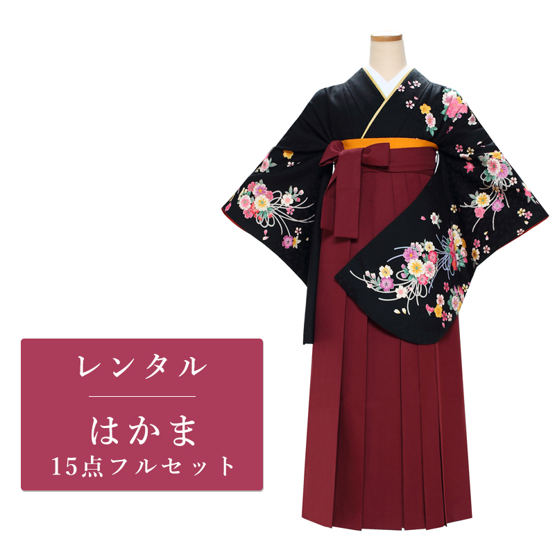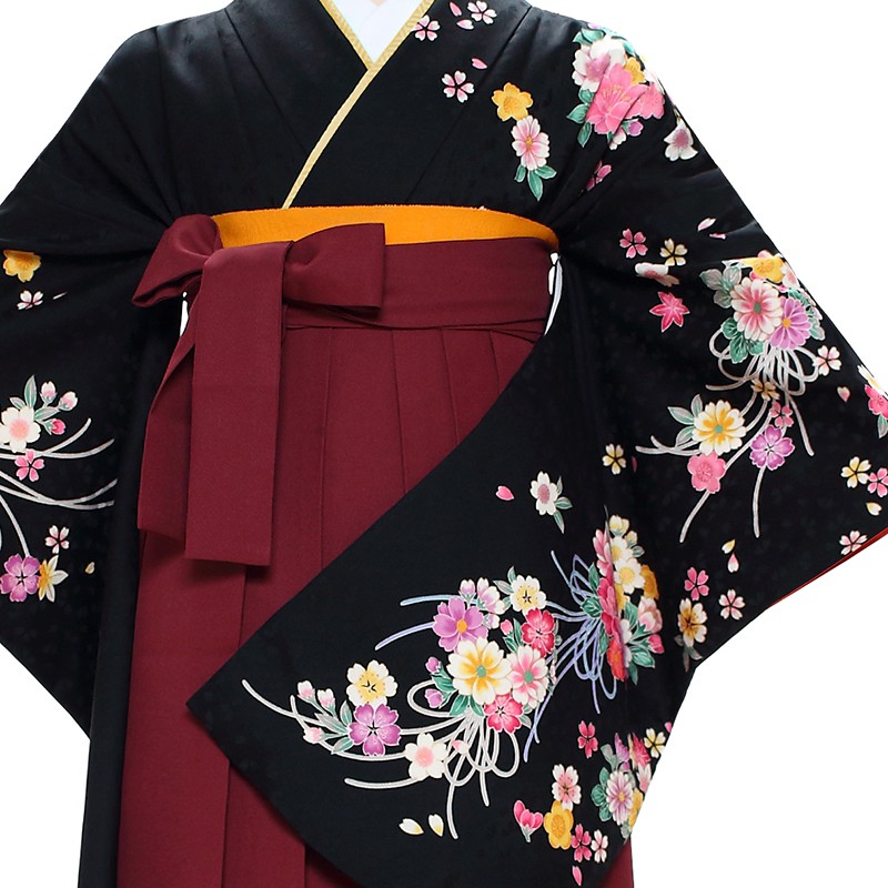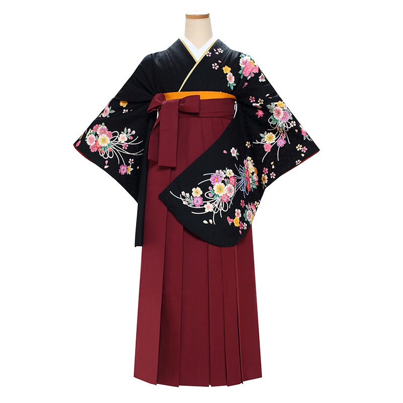 女の子の卒業式のお祝いにぴったりのレンタル着物と袴セットです。日本の伝統柄のテイストでブラック花束|古典柄のお着物となります。