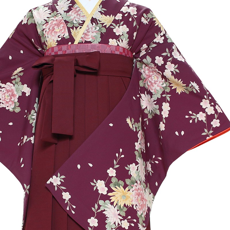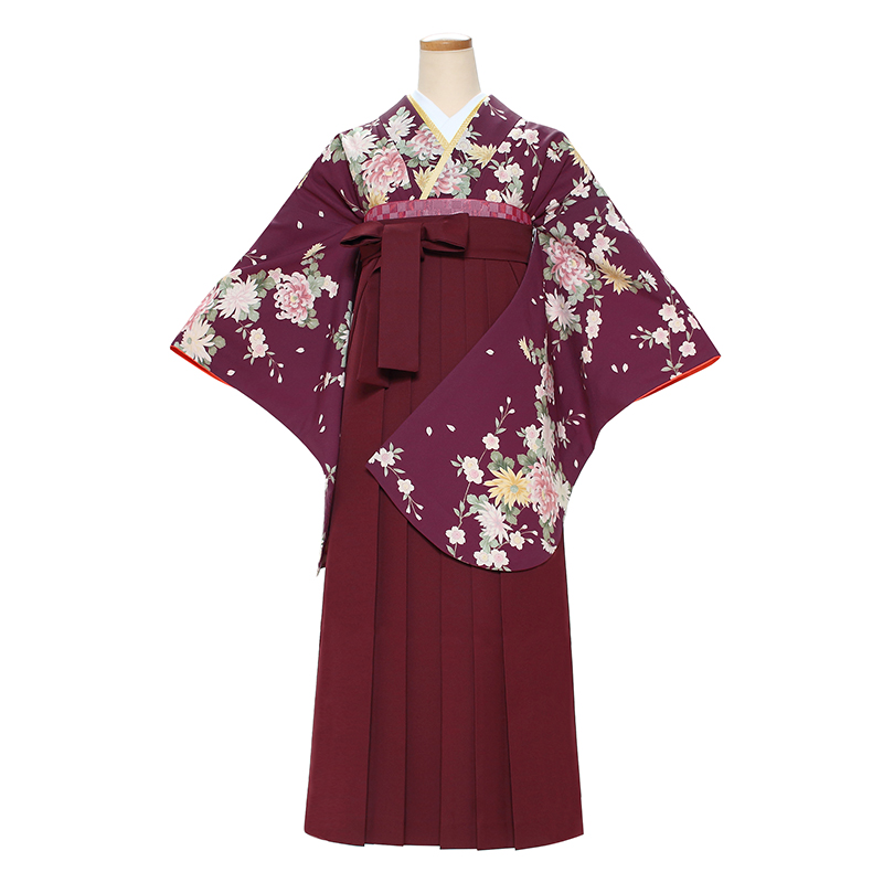 女の子の卒業式のお祝いにぴったりのレンタル着物と袴セットです。日本の伝統柄のテイストでパープル桜|菊|花柄のお着物となります。