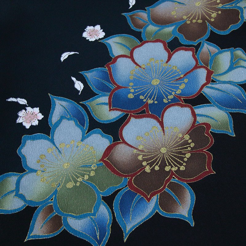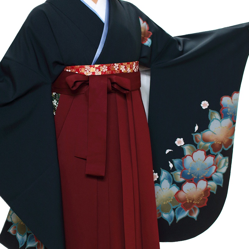 女の子の卒業式のお祝いにぴったりのレンタル着物と袴セットです。日本の伝統柄のテイストでブラック花柄のお着物となります。