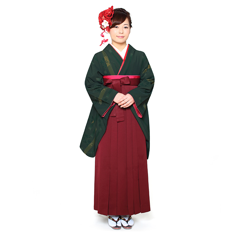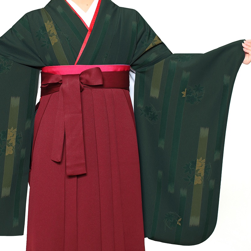 女の子の卒業式のお祝いにぴったりのレンタル着物と袴セットです。日本の伝統柄のテイストでグリーン花柄|ストライプのお着物となります。