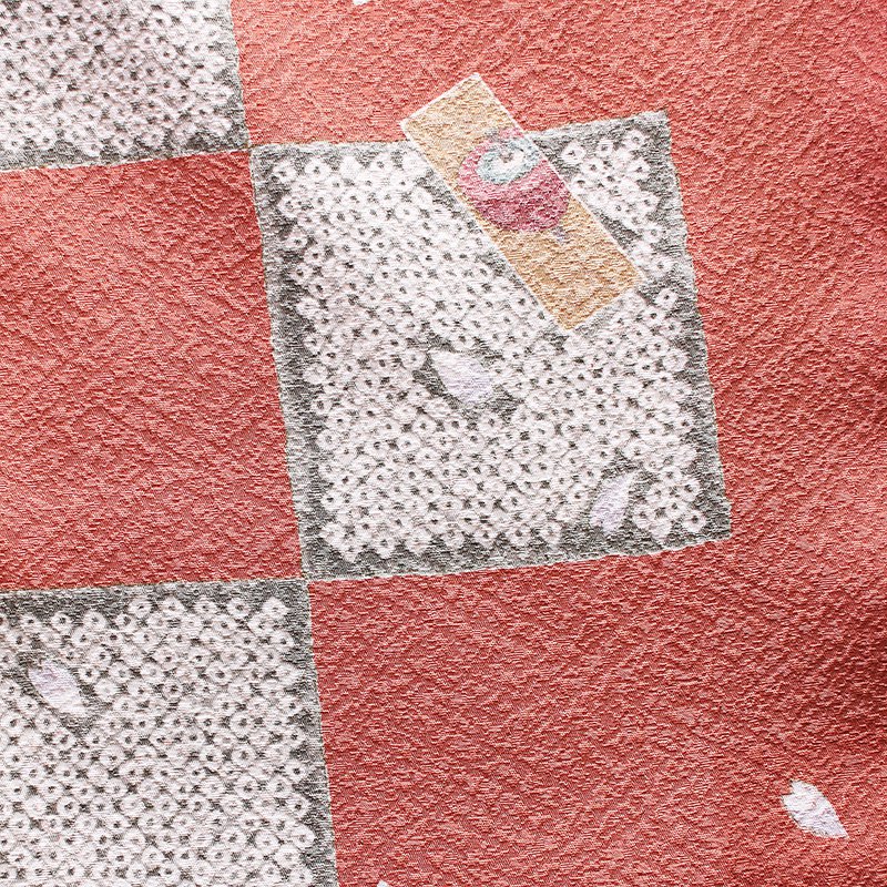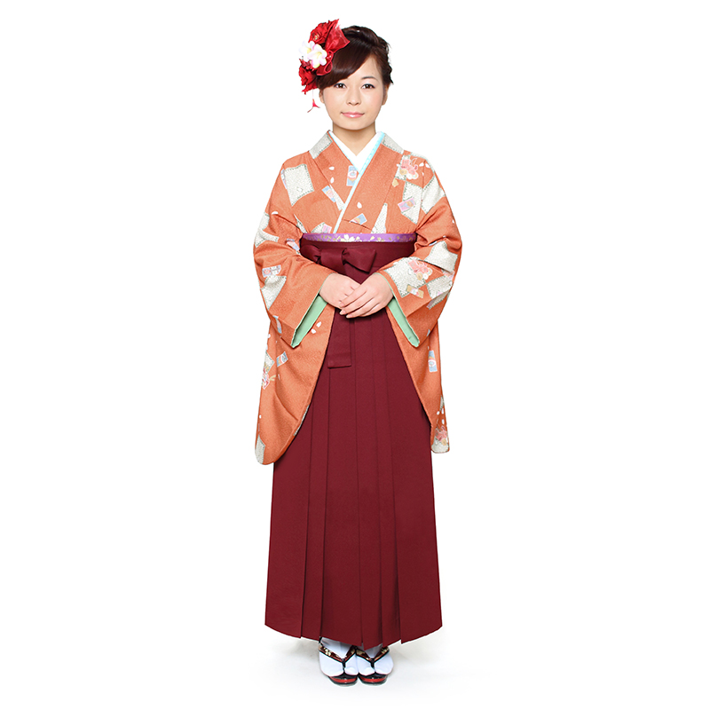 女の子の卒業式のお祝いにぴったりのレンタル着物と袴セットです。日本の伝統柄のテイストでオレンジ市松|桜|古典柄|花柄のお着物となります。