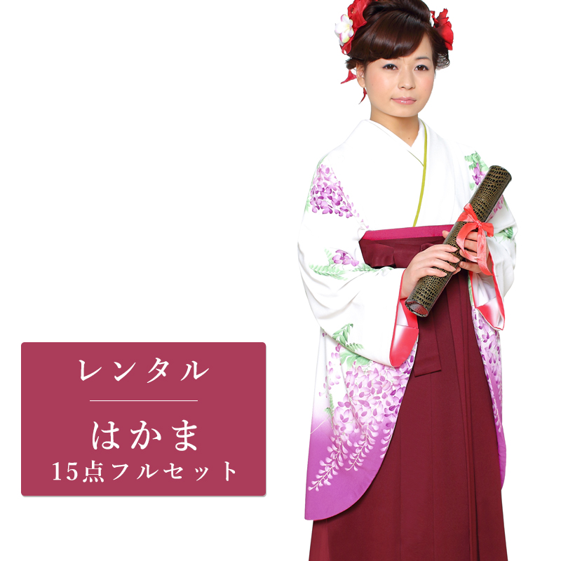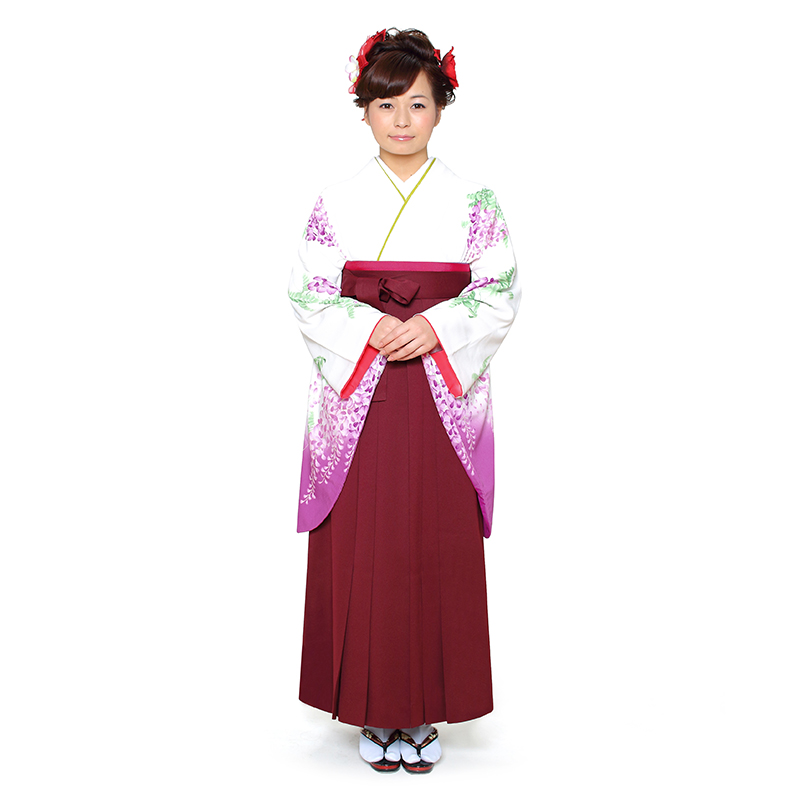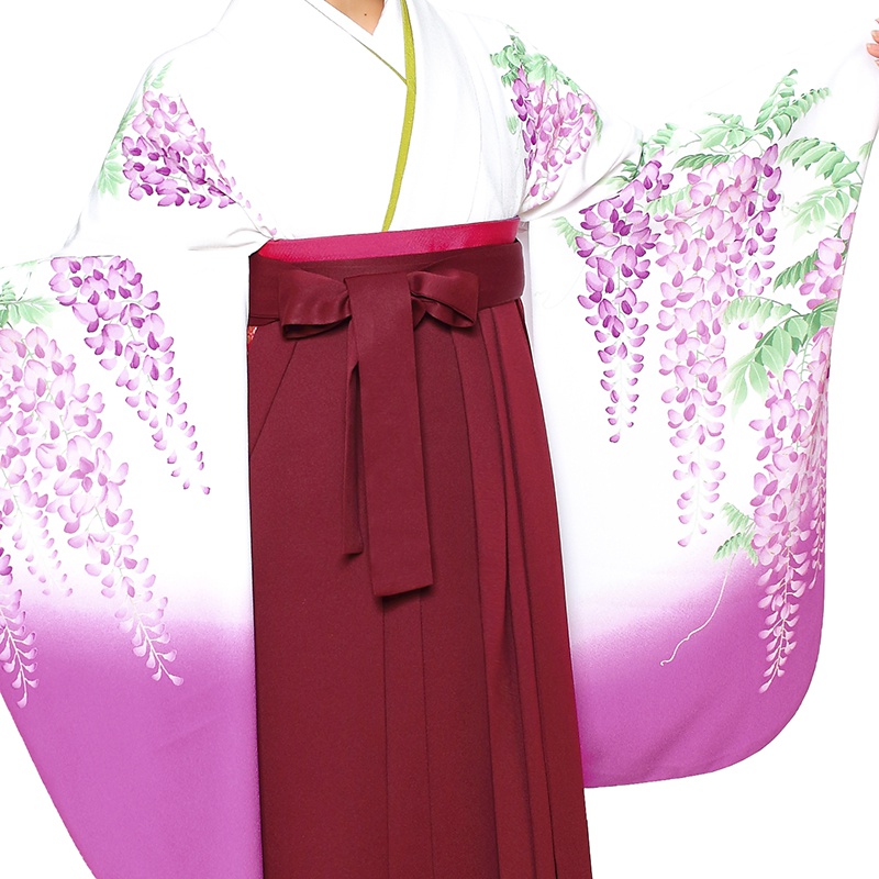女の子の卒業式のお祝いにぴったりのレンタル着物と袴セットです。日本の伝統柄のテイストでホワイト藤|花柄のお着物となります。