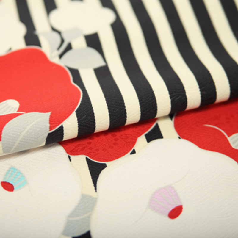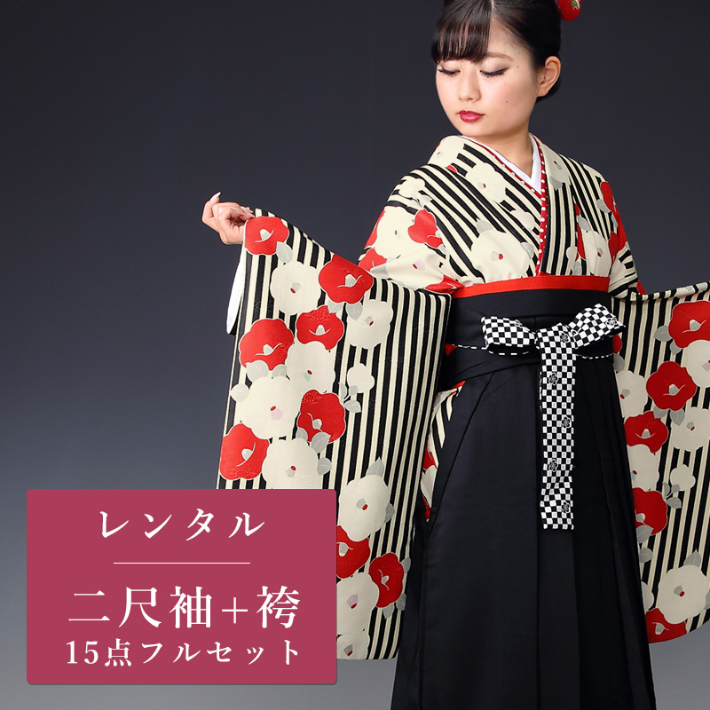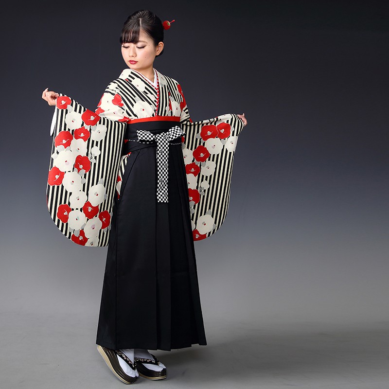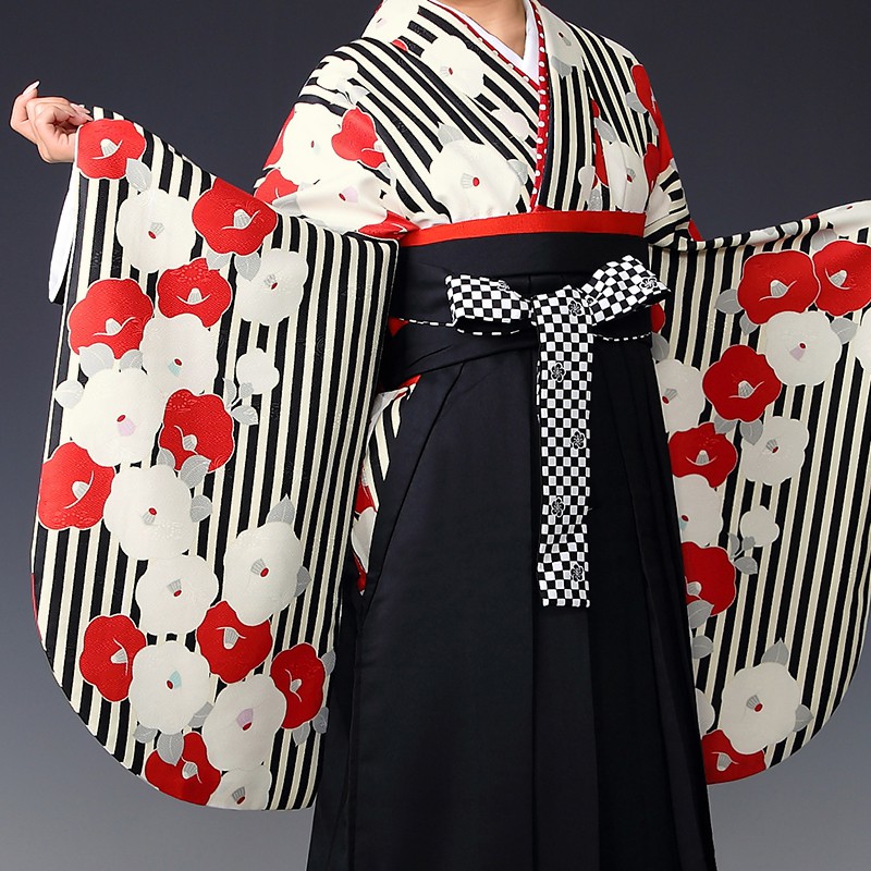 女の子の卒業式のお祝いにぴったりのレンタル着物と袴セットです。モダンテイストなデザインでブラック椿|ストライプ|花柄のお着物となります。