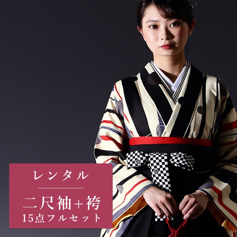卒業式 着物 袴 15点セット 二尺袖 卒業袴 クリーム|ブラック ストライプ|水玉 g410