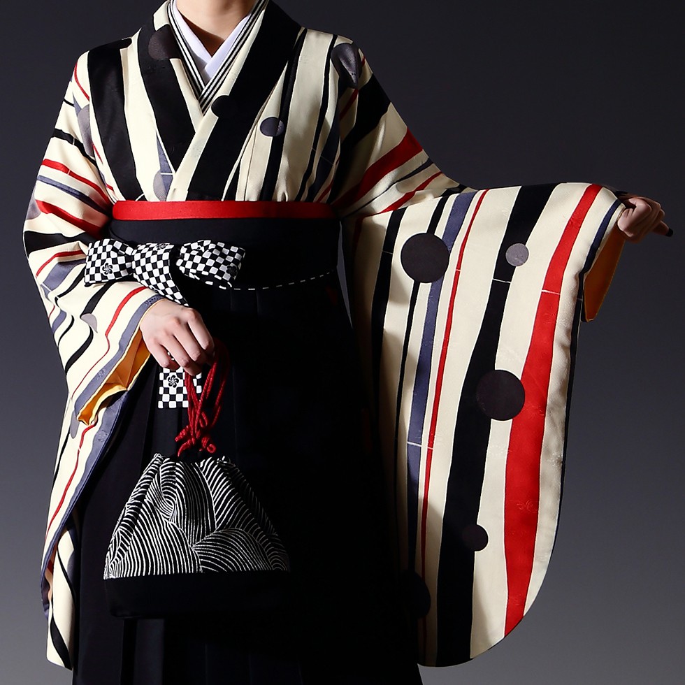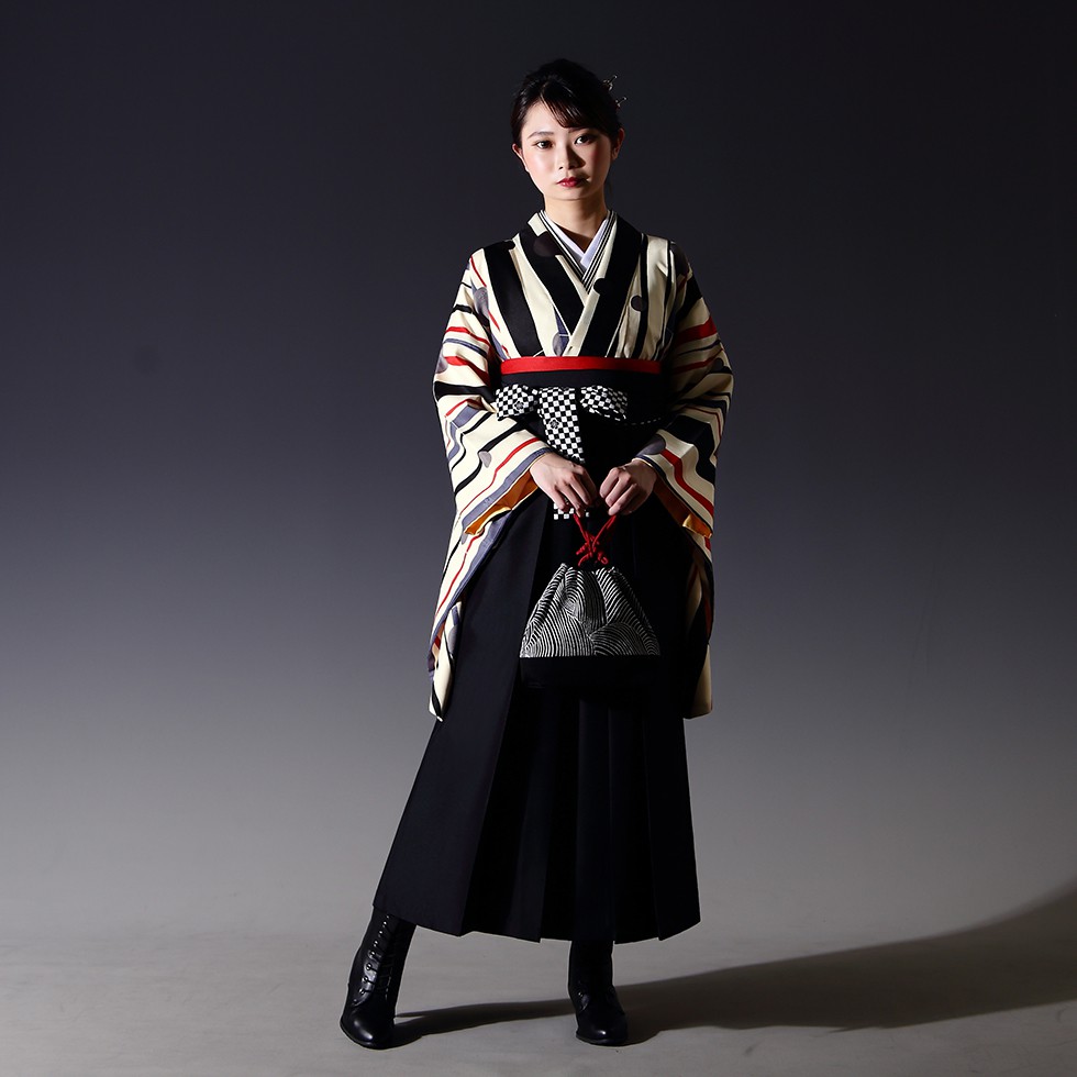 女の子の卒業式のお祝いにぴったりのレンタル着物と袴セットです。モダンテイストなデザインでクリーム|ブラックストライプ|水玉のお着物となります。
