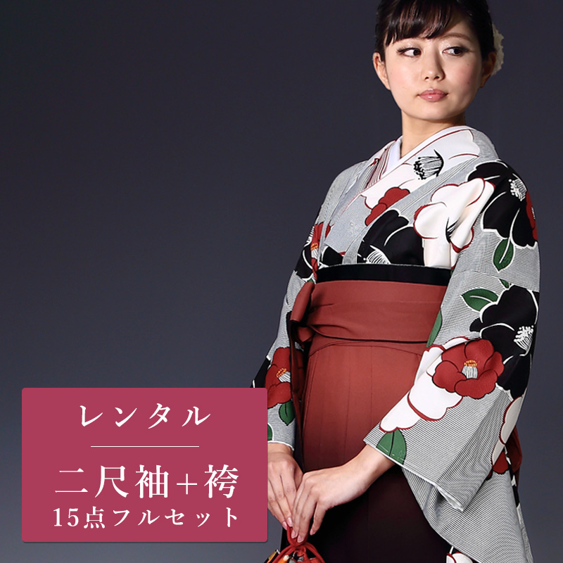 卒業式 着物 袴 15点セット 二尺袖 卒業袴 グレー 椿|ストライプ|花柄 g415