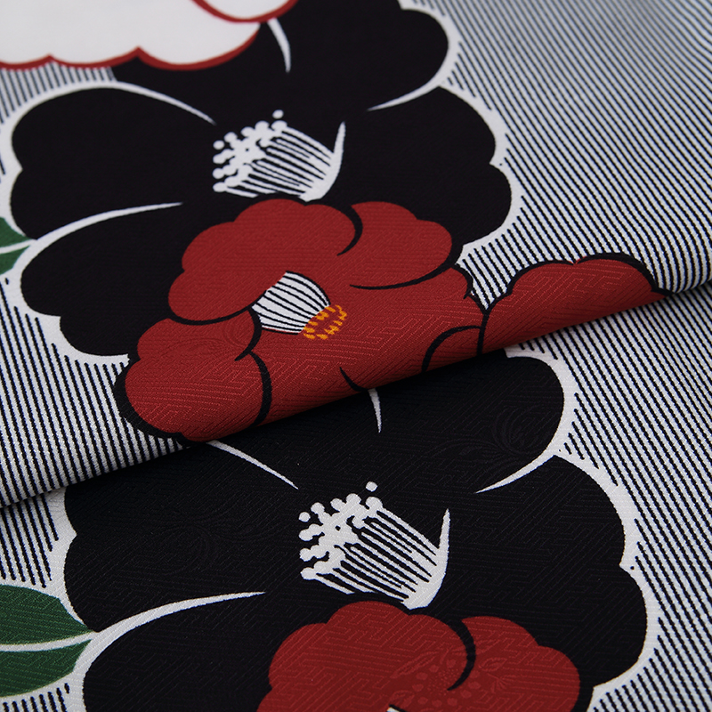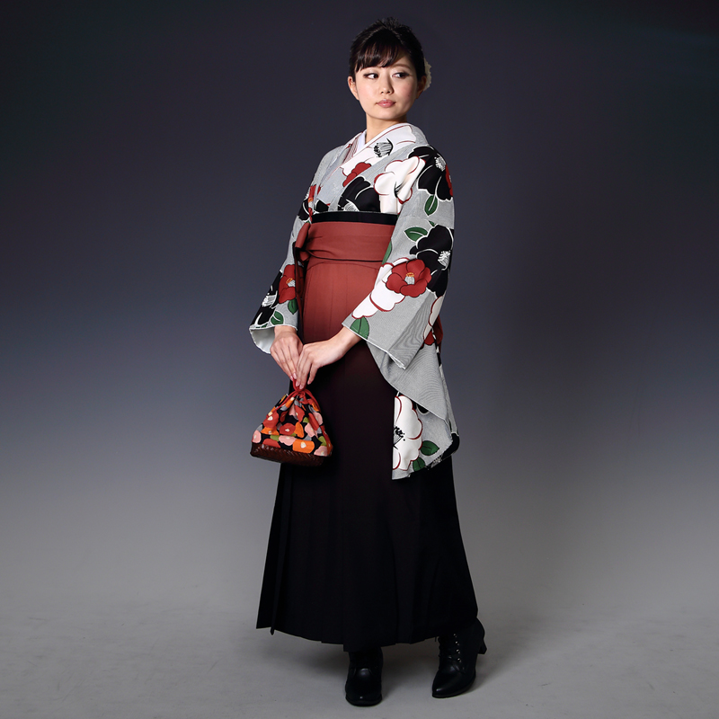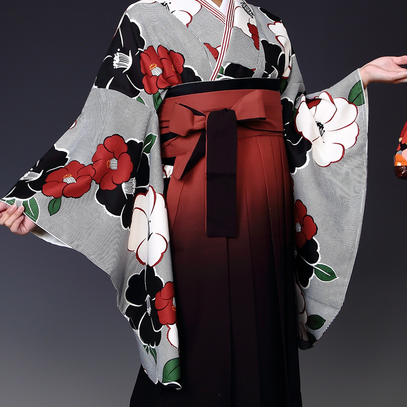 女の子の卒業式のお祝いにぴったりのレンタル着物と袴セットです。モダンテイストなデザインでグレー椿|ストライプ|花柄のお着物となります。