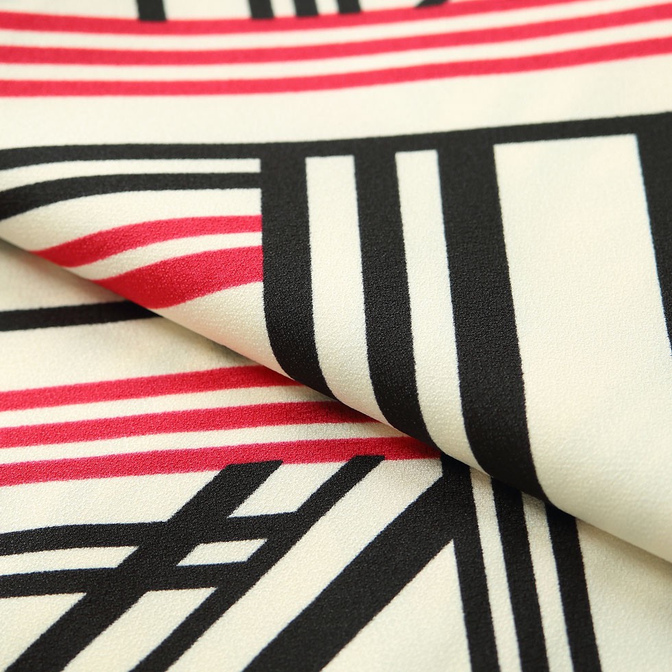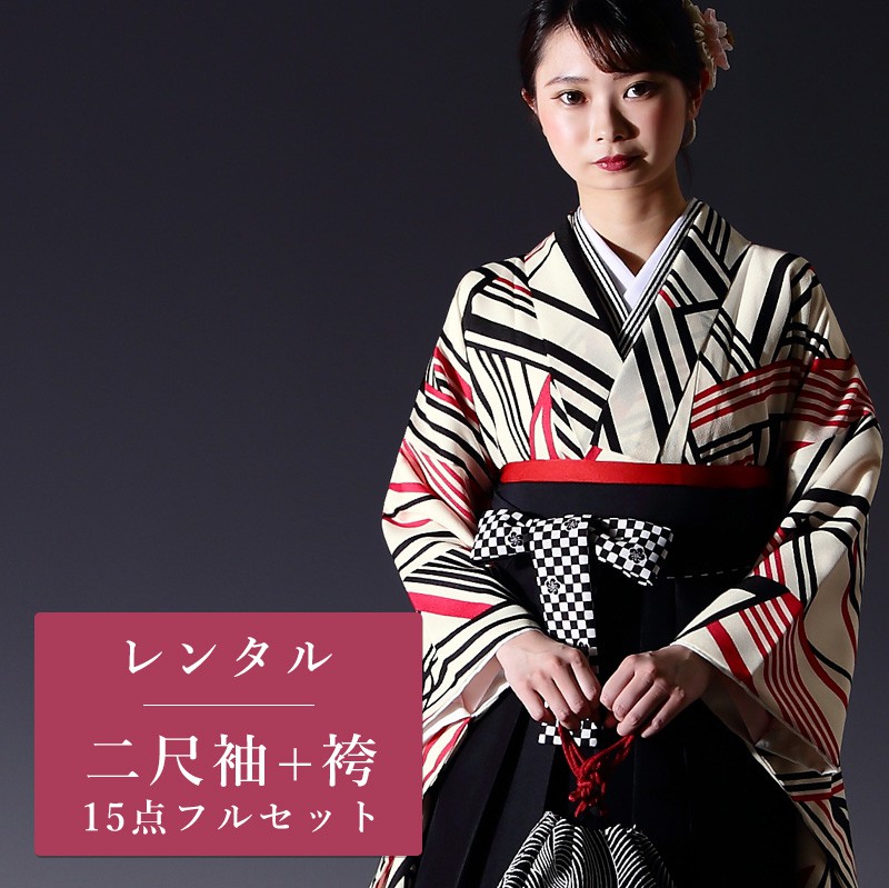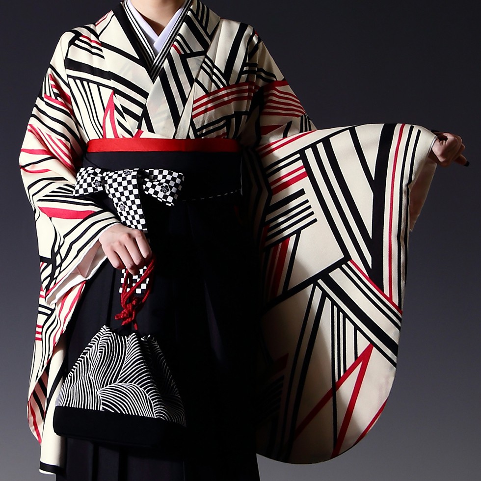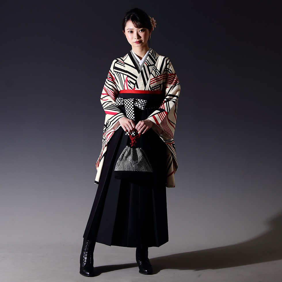女の子の卒業式のお祝いにぴったりのレンタル着物と袴セットです。モダンテイストなデザインでクリーム|ブラック|レッド幾何学模様|ストライプのお着物となります。