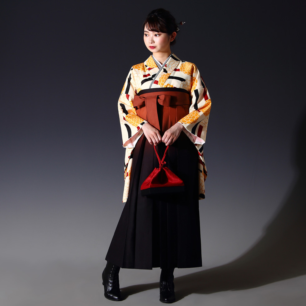 女の子の卒業式のお祝いにぴったりのレンタル着物と袴セットです。モダンテイストなデザインでクリーム|イエロー菊|花柄のお着物となります。