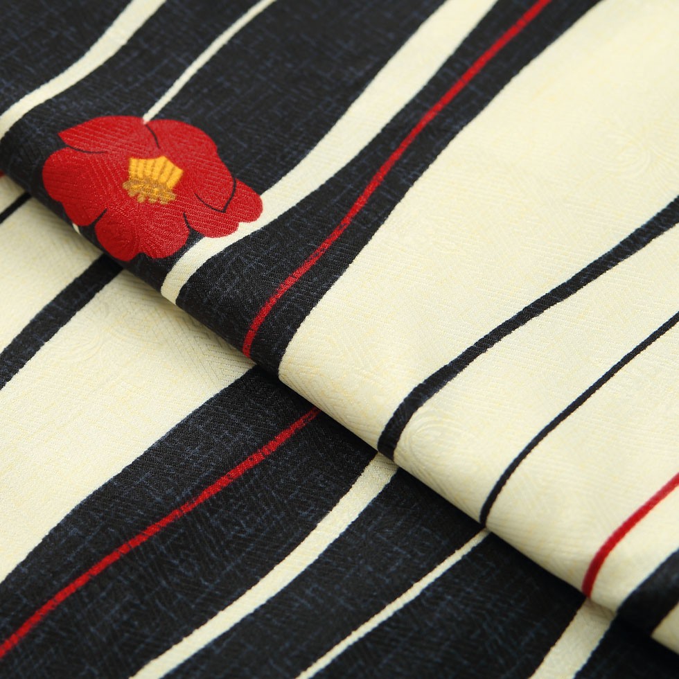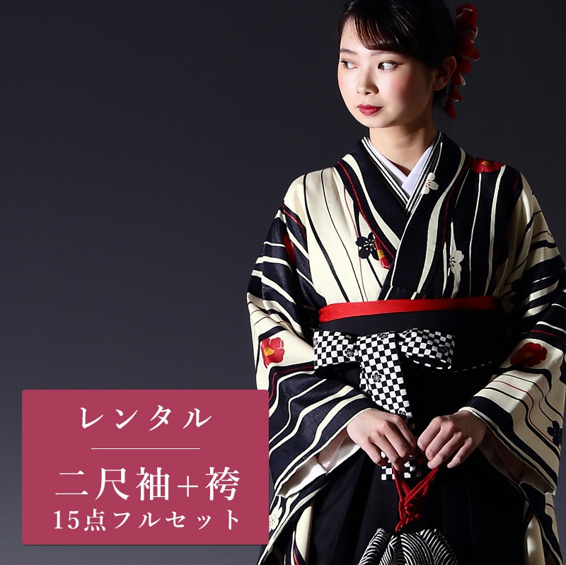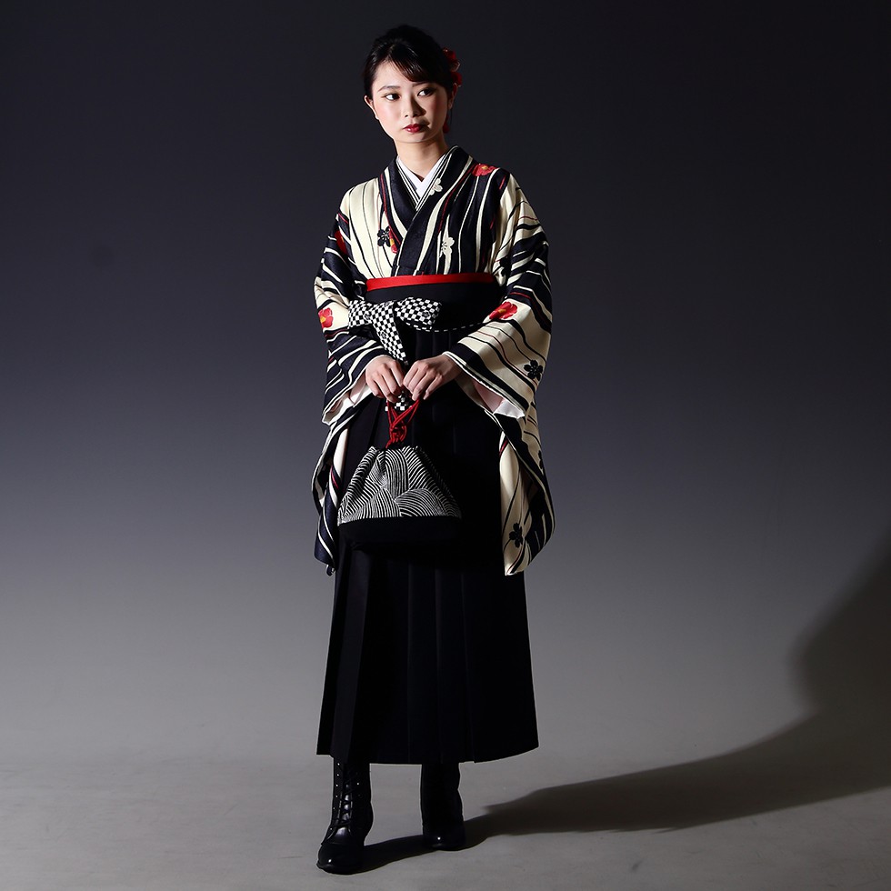 女の子の卒業式のお祝いにぴったりのレンタル着物と袴セットです。モダンテイストなデザインでブラック花柄|ストライプのお着物となります。