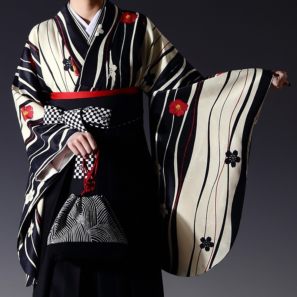 卒業式 着物 袴 15点セット 二尺袖 卒業袴 ブラック 花柄|ストライプ g434