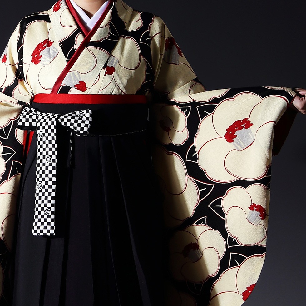 女の子の卒業式のお祝いにぴったりのレンタル着物と袴セットです。モダンテイストなデザインでブラック|クリーム椿|花柄のお着物となります。