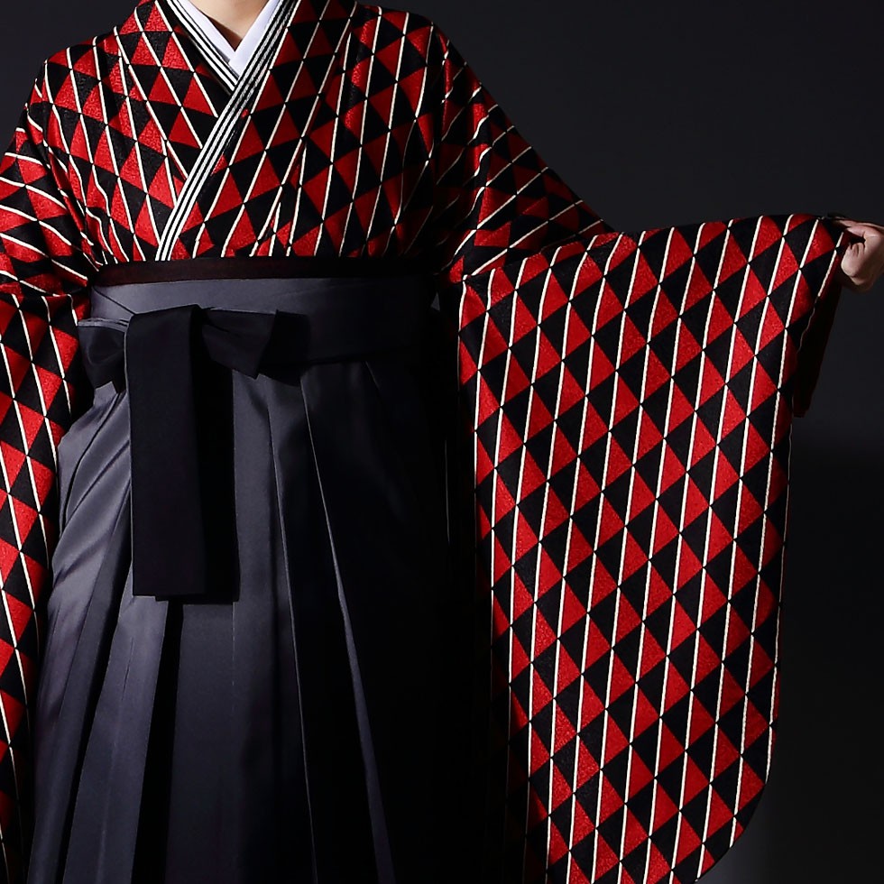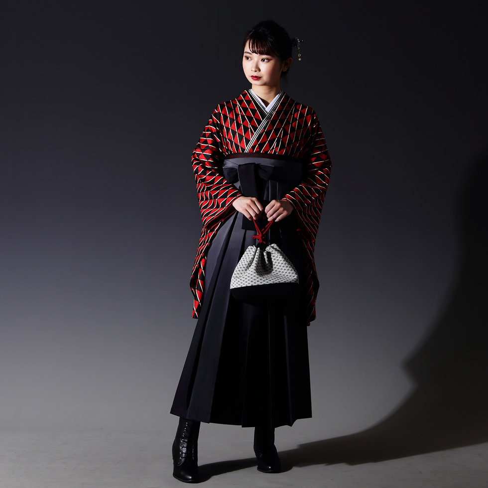 女の子の卒業式のお祝いにぴったりのレンタル着物と袴セットです。モダンテイストなデザインでレッド鱗|古典柄のお着物となります。