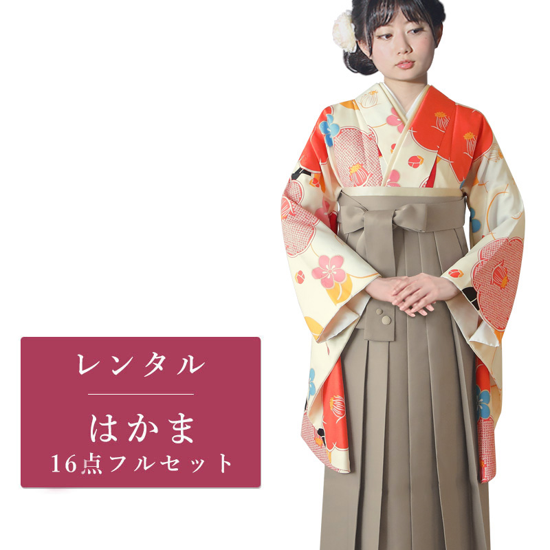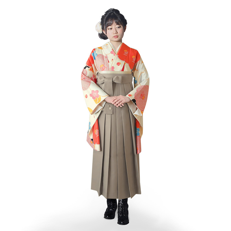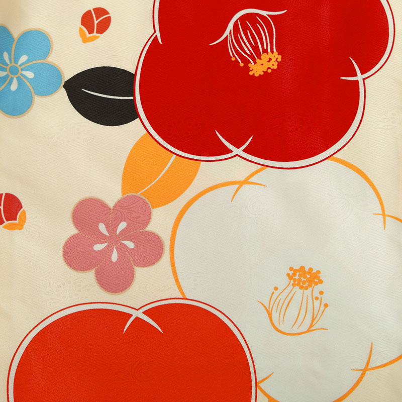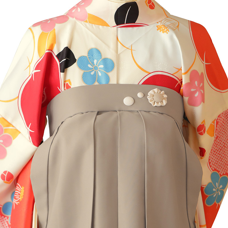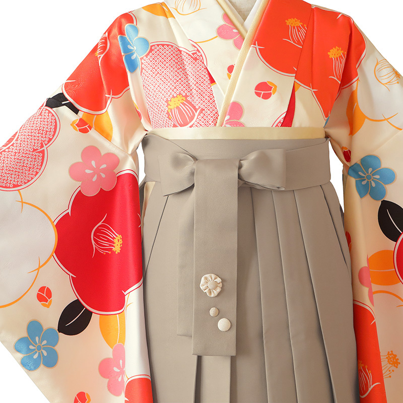 女の子の卒業式のお祝いにぴったりのレンタル着物と袴セットです。トレンド感のあるデザインでクリーム|レッド椿|梅|花柄のお着物となります。