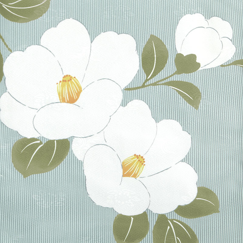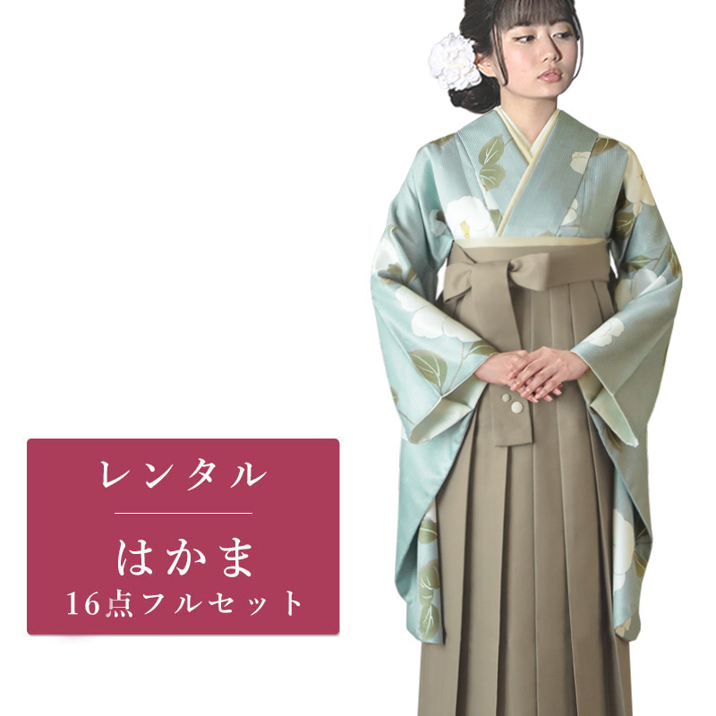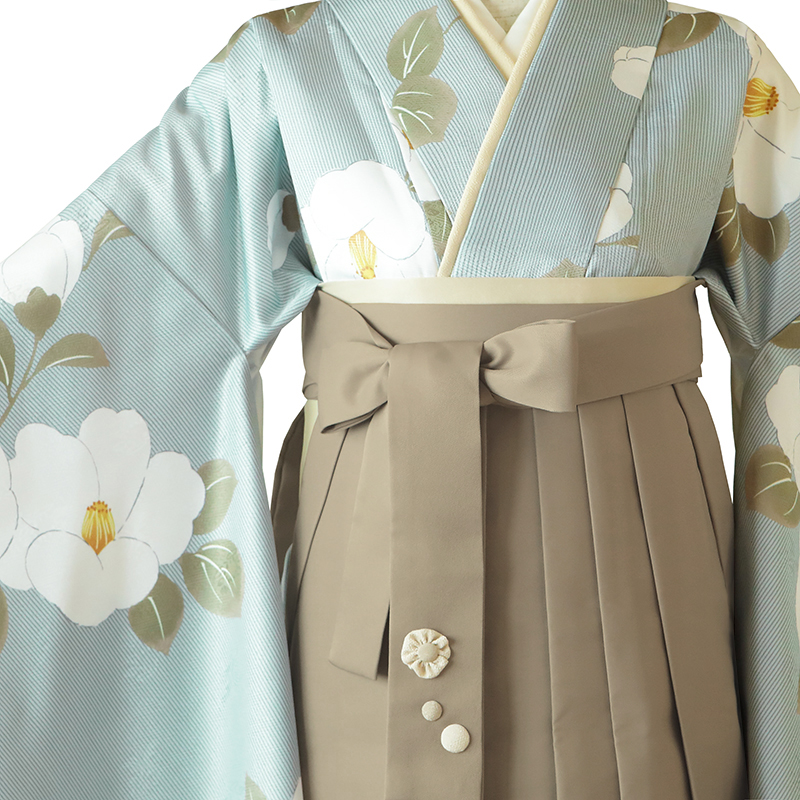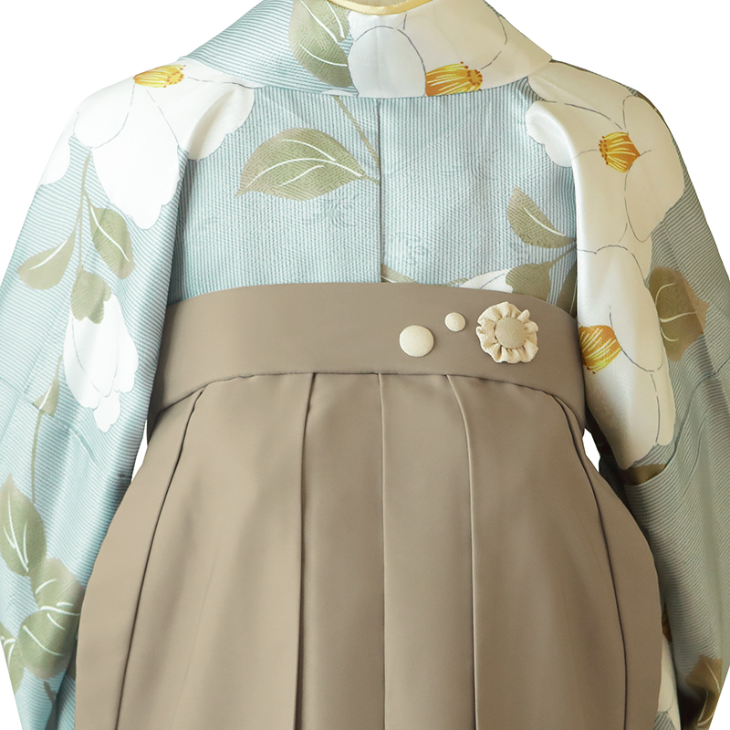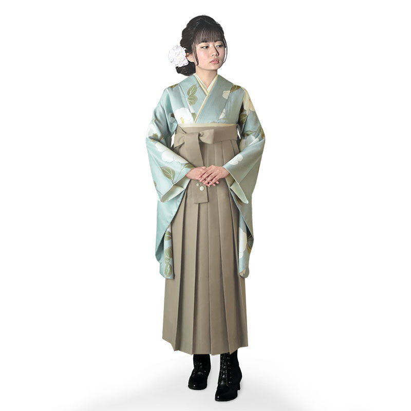 女の子の卒業式のお祝いにぴったりのレンタル着物と袴セットです。トレンド感のあるデザインでグリーン椿|花柄のお着物となります。