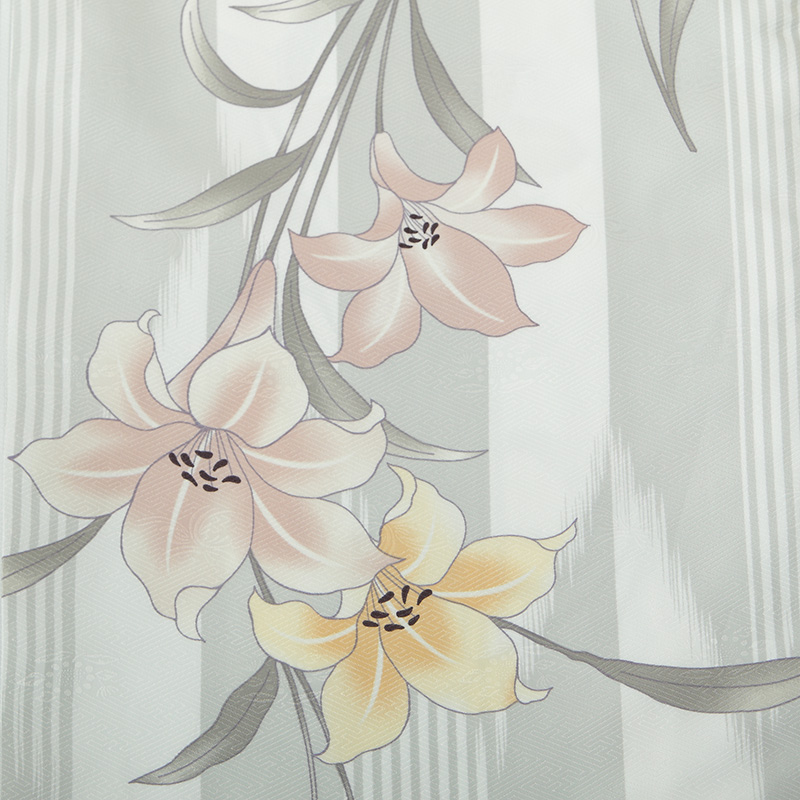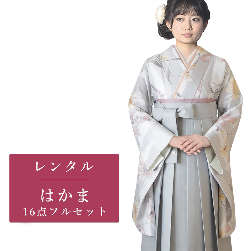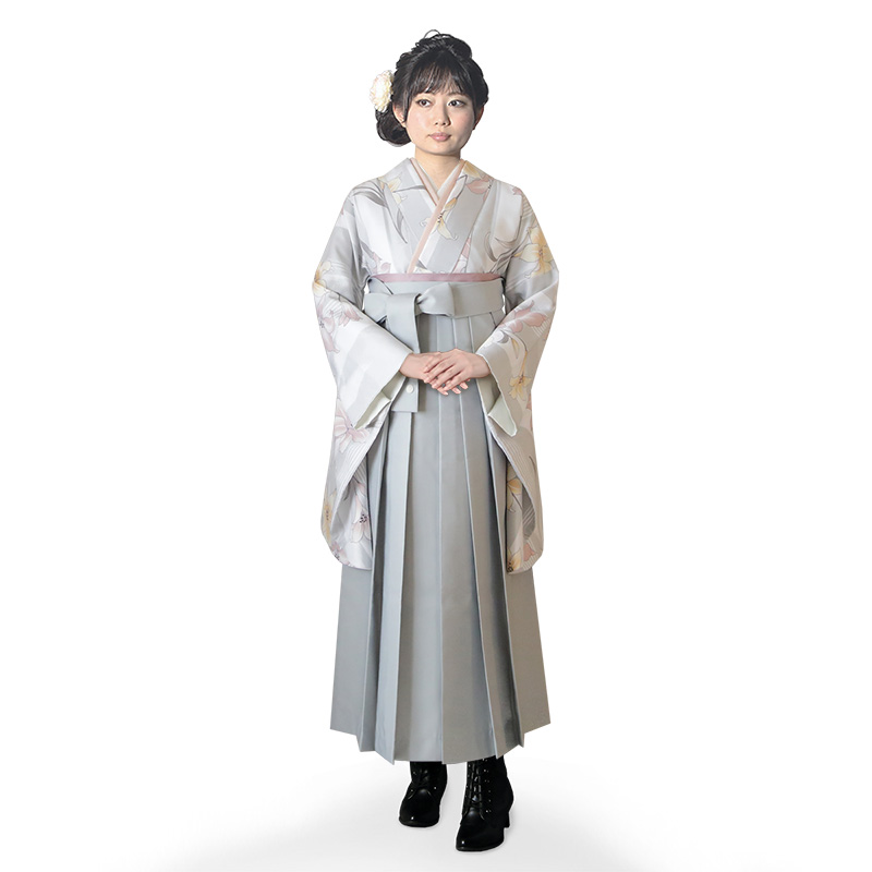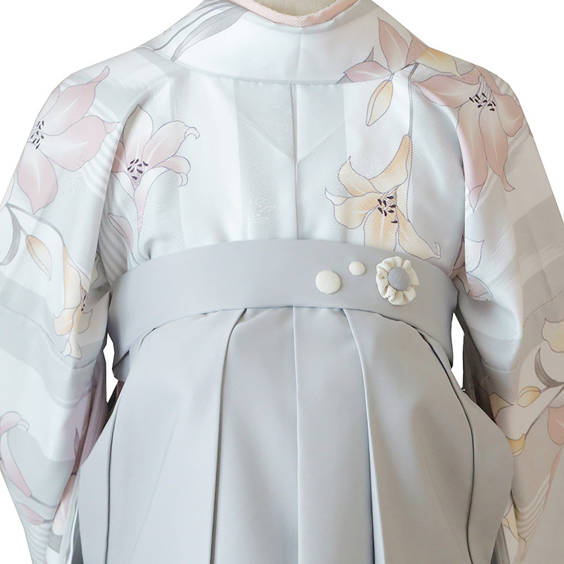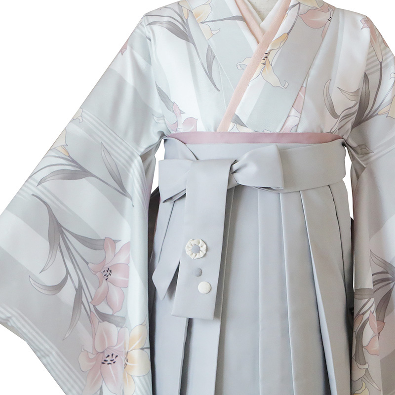 女の子の卒業式のお祝いにぴったりのレンタル着物と袴セットです。トレンド感のあるデザインでグレー百合|ストライプ|花柄のお着物となります。