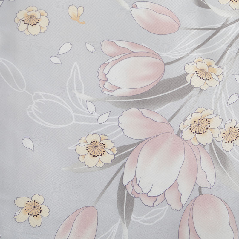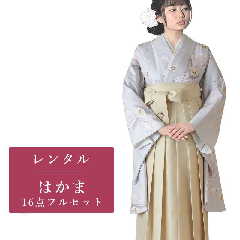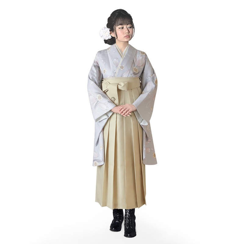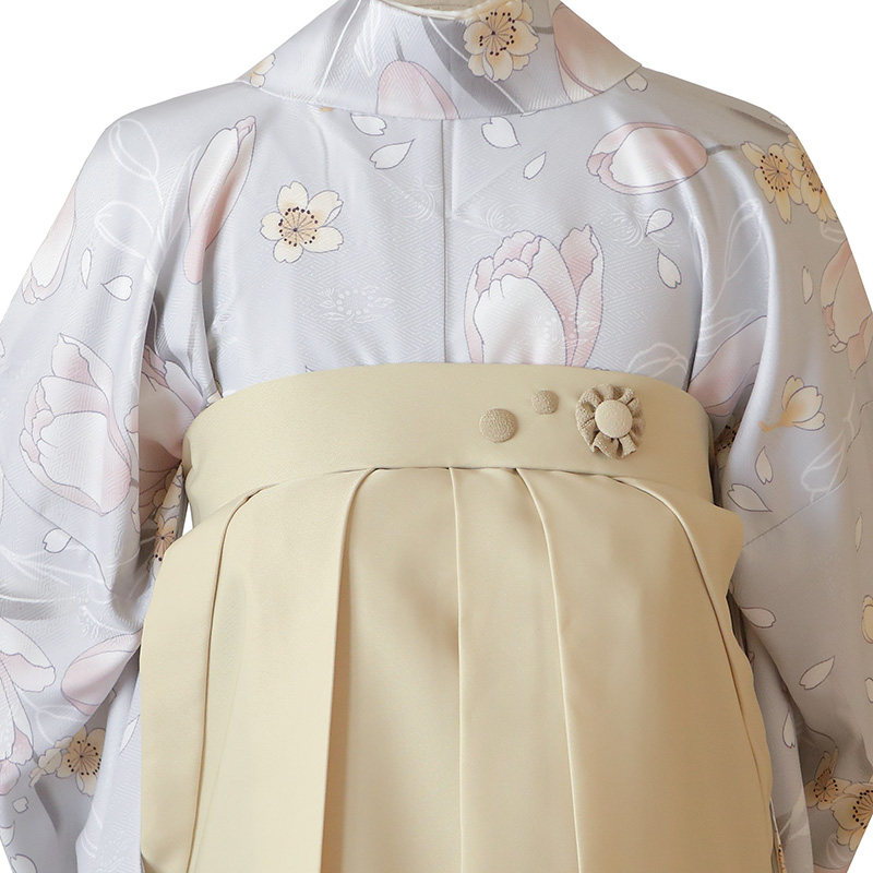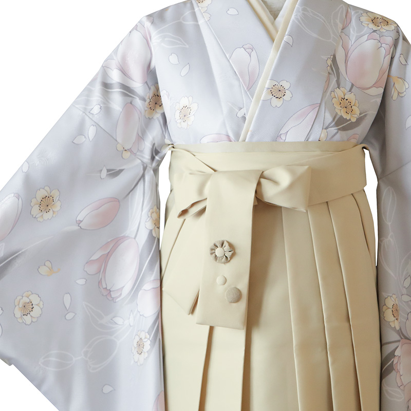 女の子の卒業式のお祝いにぴったりのレンタル着物と袴セットです。トレンド感のあるデザインでグレーチューリップ|花柄のお着物となります。
