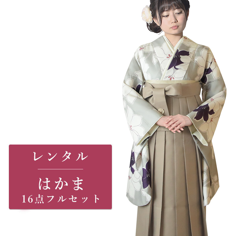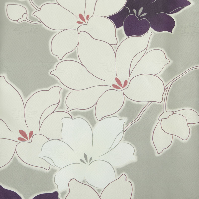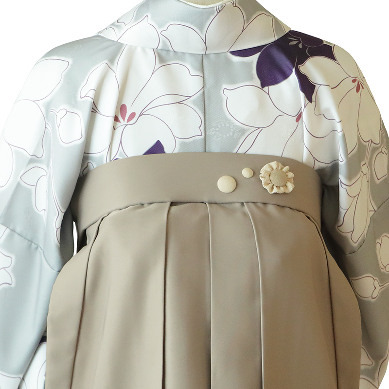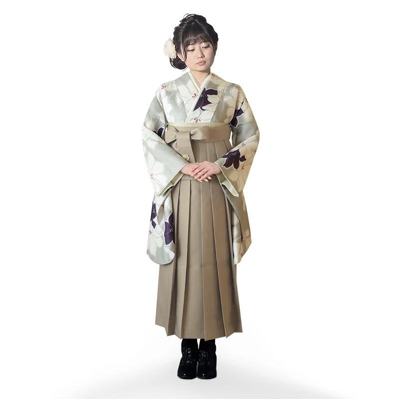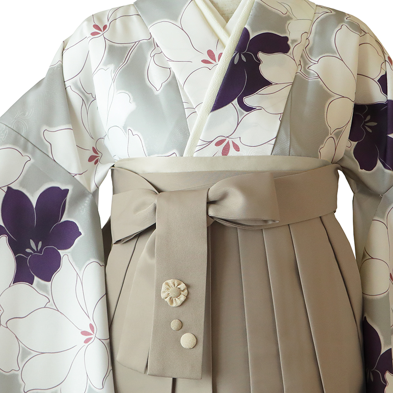 女の子の卒業式のお祝いにぴったりのレンタル着物と袴セットです。トレンド感のあるデザインでグレー|ホワイト|パープル花柄のお着物となります。