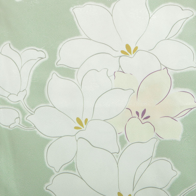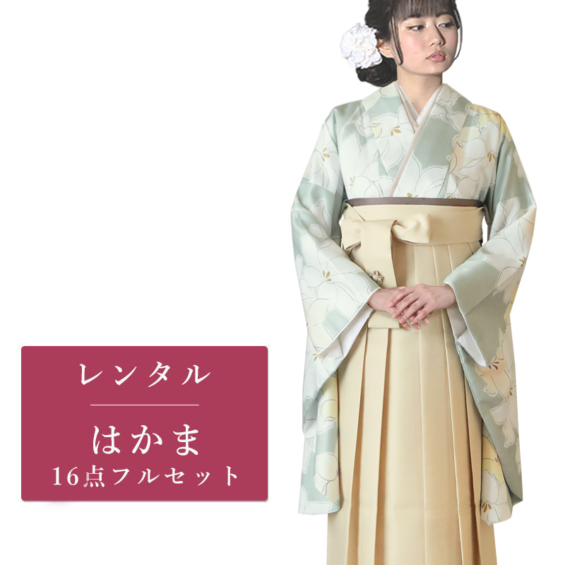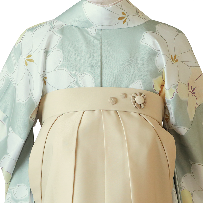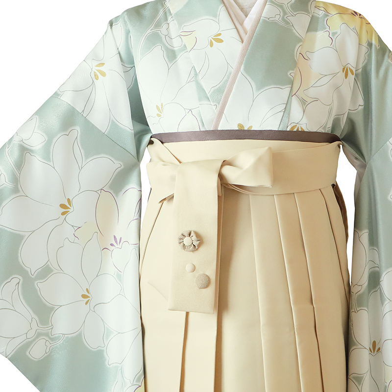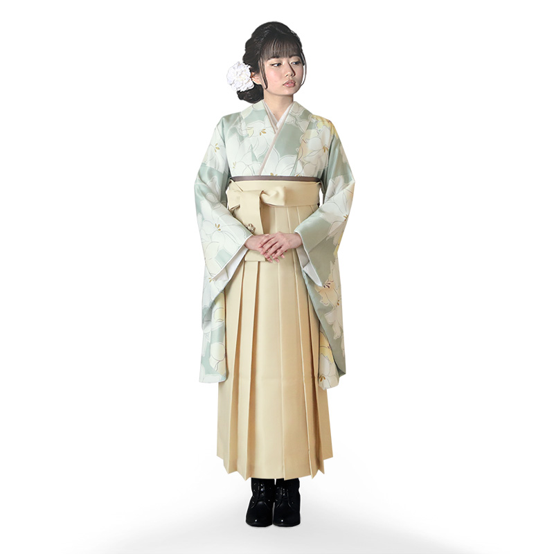 女の子の卒業式のお祝いにぴったりのレンタル着物と袴セットです。トレンド感のあるデザインでグリーン花柄のお着物となります。
