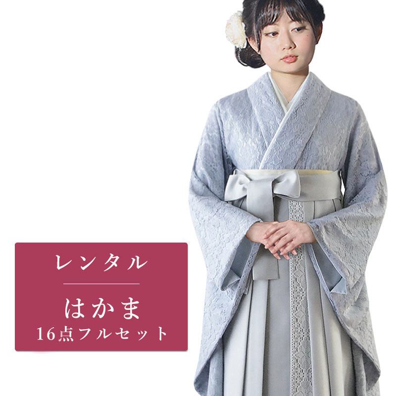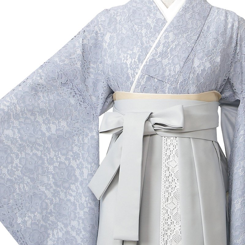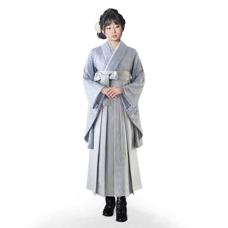 女の子の卒業式のお祝いにぴったりのレンタル着物と袴セットです。トレンド感のあるデザインでグレー花柄|レースのお着物となります。