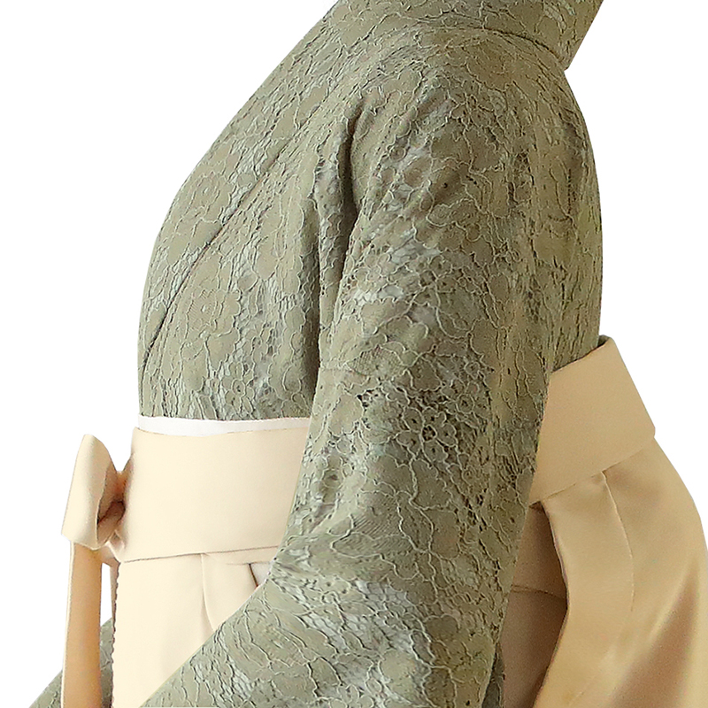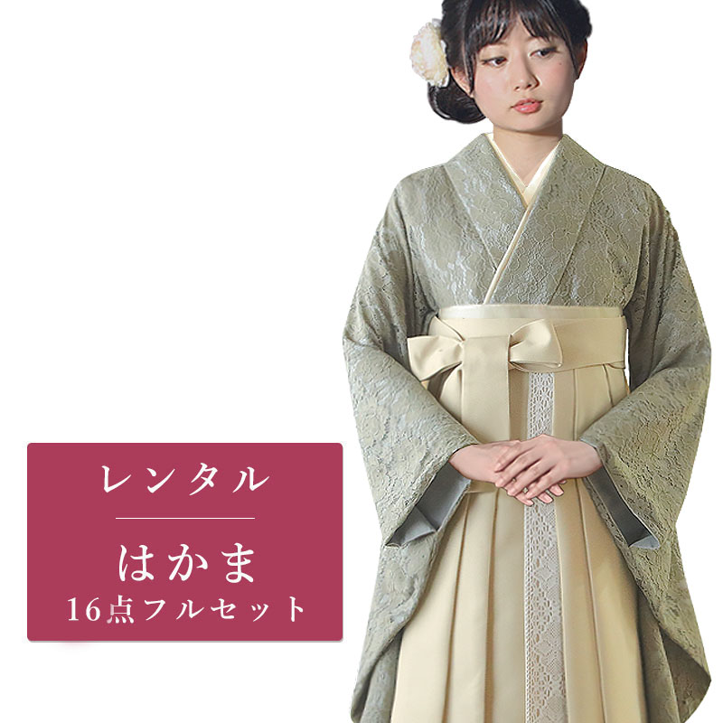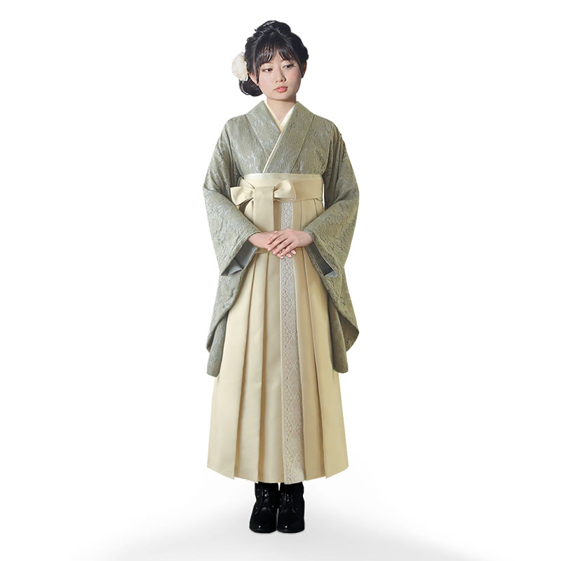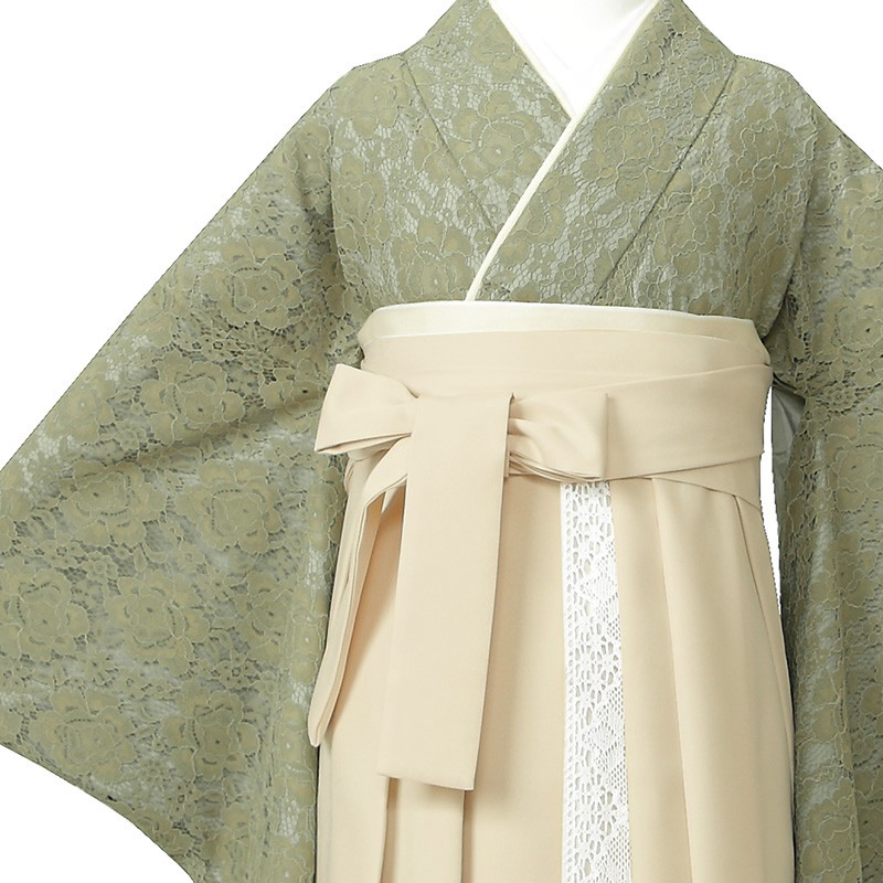 女の子の卒業式のお祝いにぴったりのレンタル着物と袴セットです。トレンド感のあるデザインでグリーン花柄|レースのお着物となります。