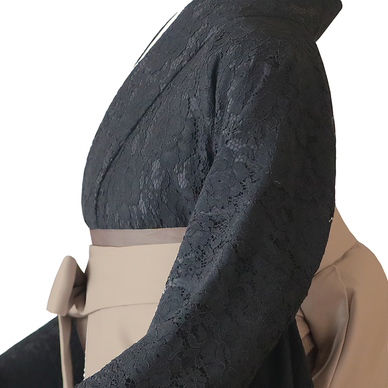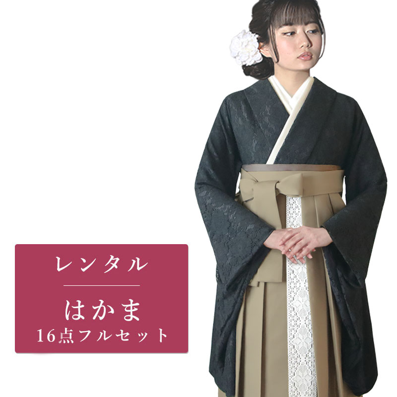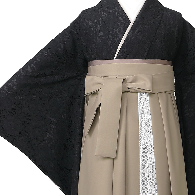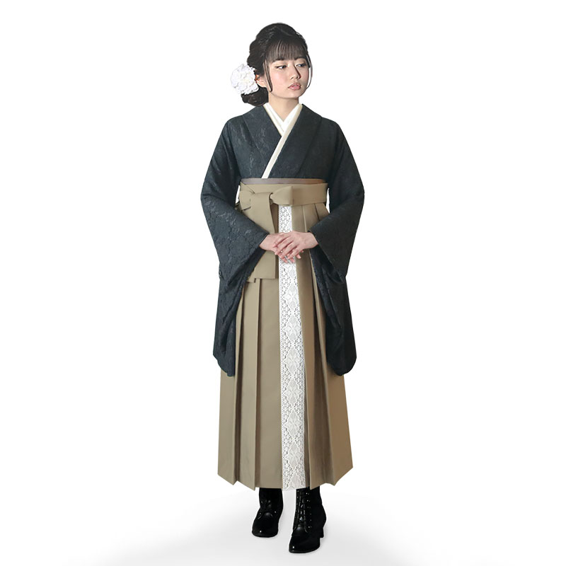女の子の卒業式のお祝いにぴったりのレンタル着物と袴セットです。トレンド感のあるデザインでブラック花柄|レースのお着物となります。
