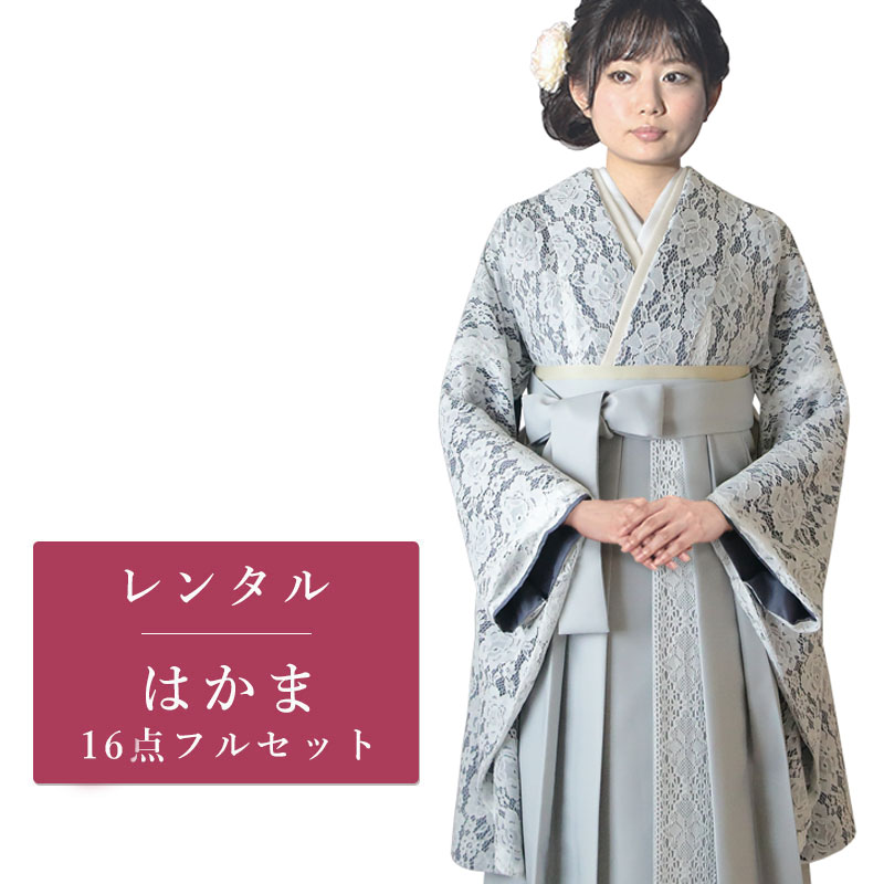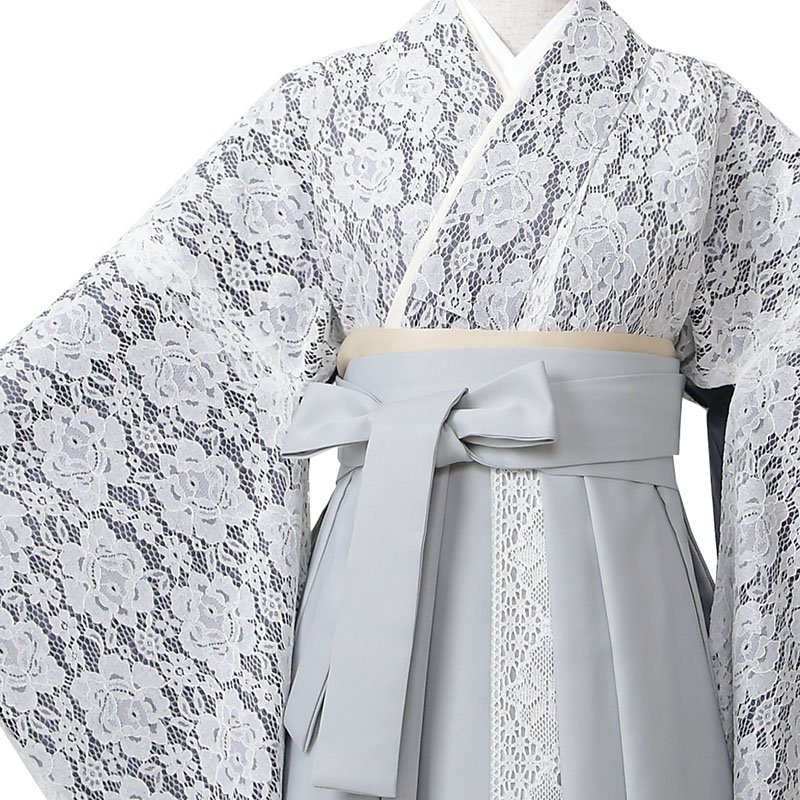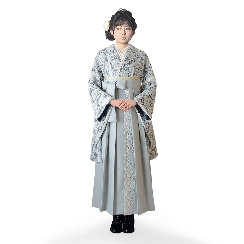 女の子の卒業式のお祝いにぴったりのレンタル着物と袴セットです。トレンド感のあるデザインでグレー花柄|レースのお着物となります。