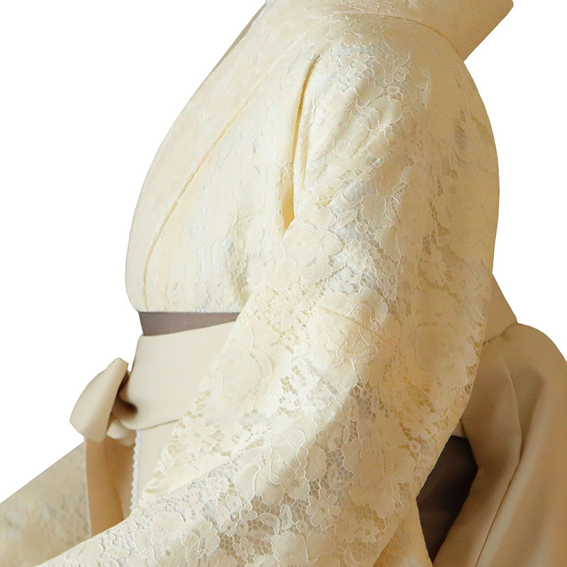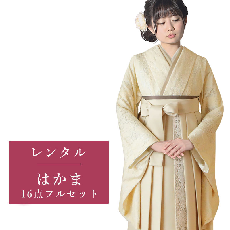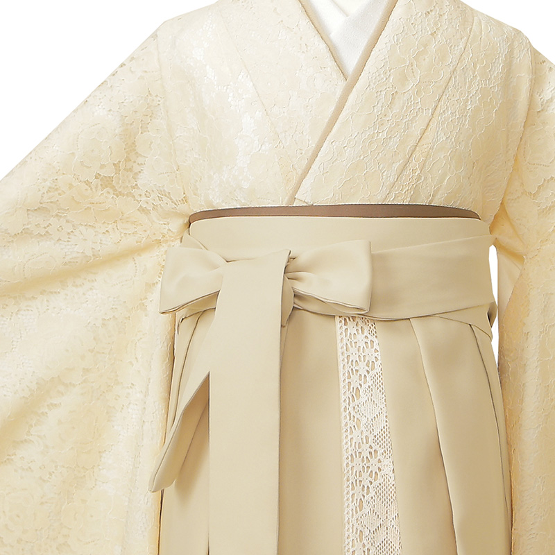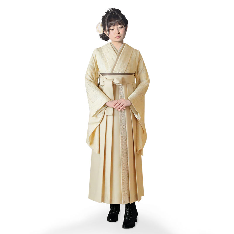 女の子の卒業式のお祝いにぴったりのレンタル着物と袴セットです。トレンド感のあるデザインでベージュ花柄|レースのお着物となります。