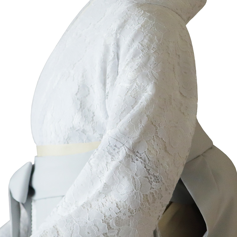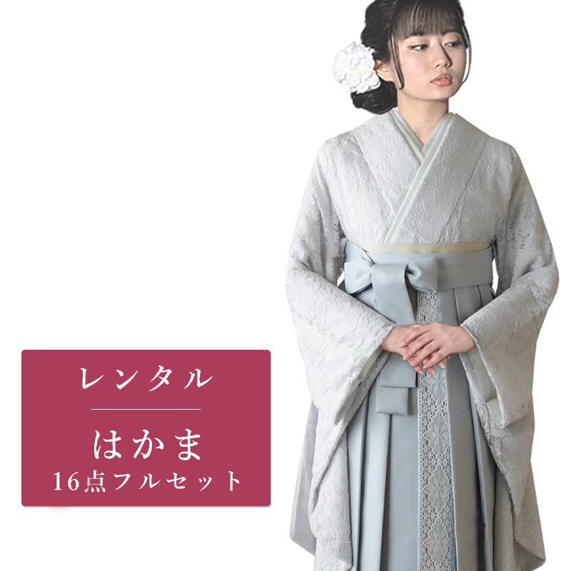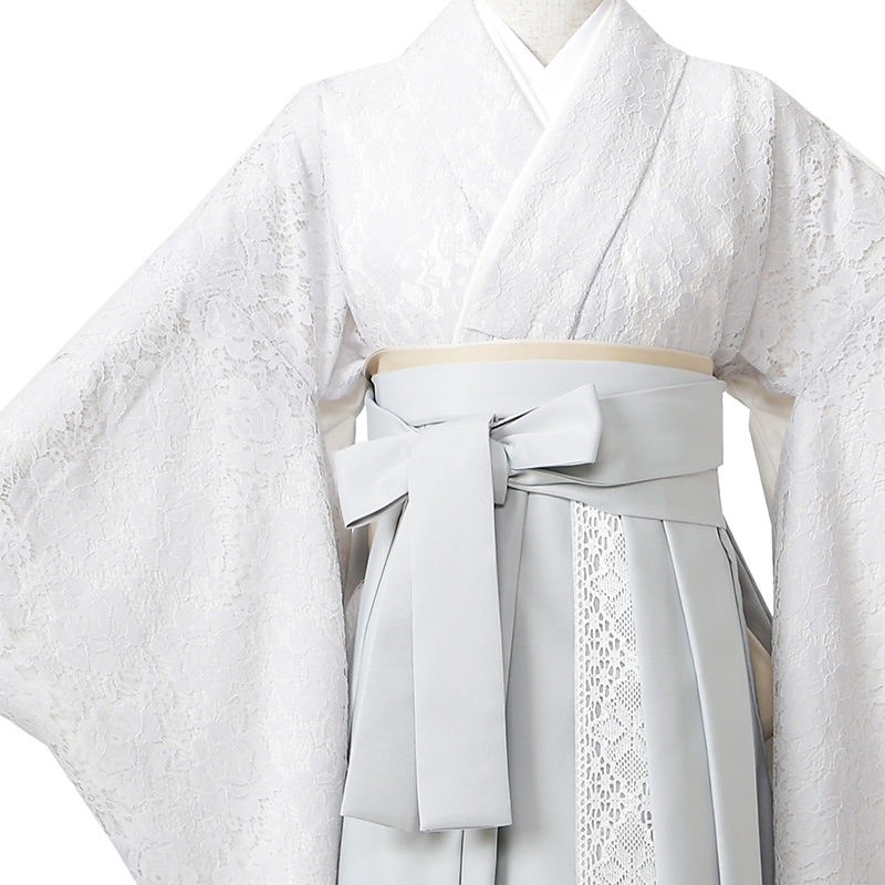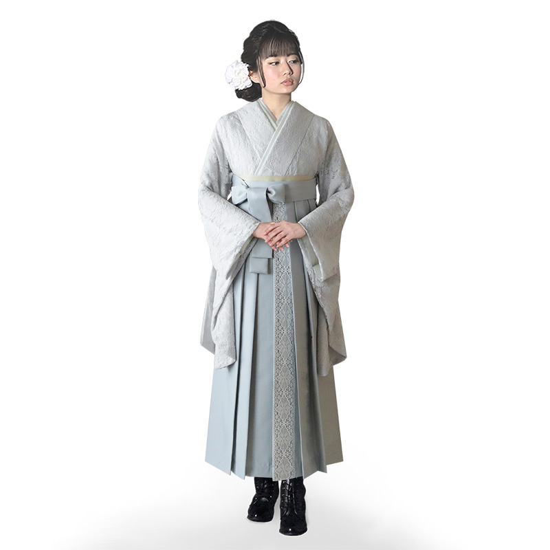 女の子の卒業式のお祝いにぴったりのレンタル着物と袴セットです。トレンド感のあるデザインでグレー花柄|レースのお着物となります。