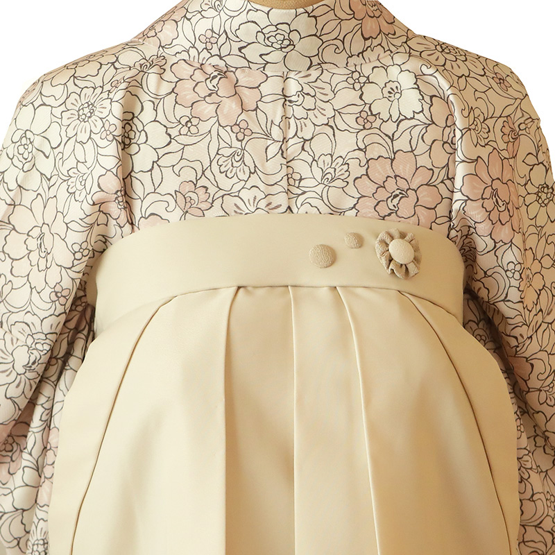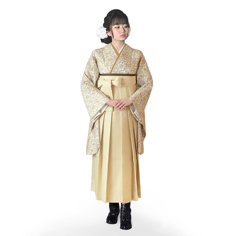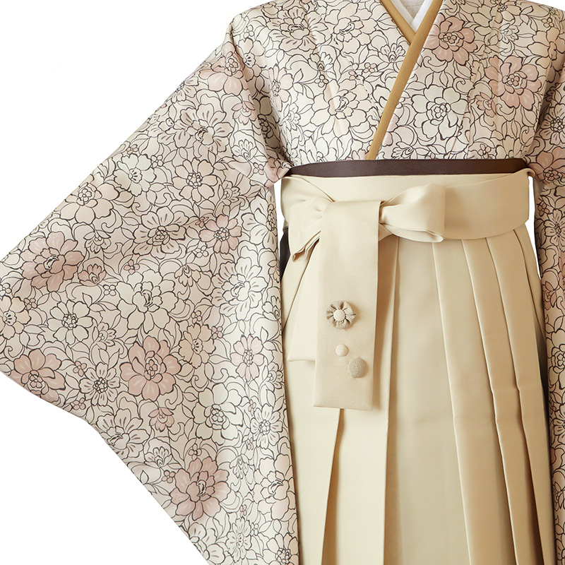 女の子の卒業式のお祝いにぴったりのレンタル着物と袴セットです。トレンド感のあるデザインでベージュ花柄のお着物となります。