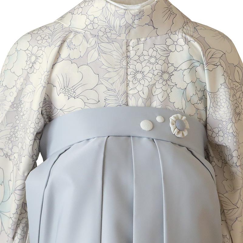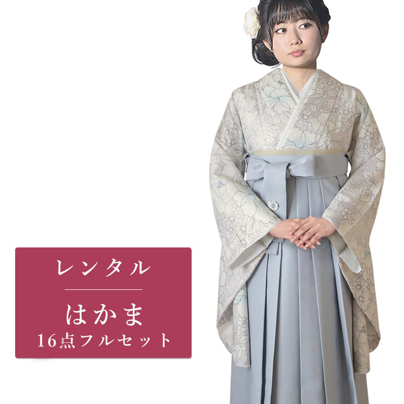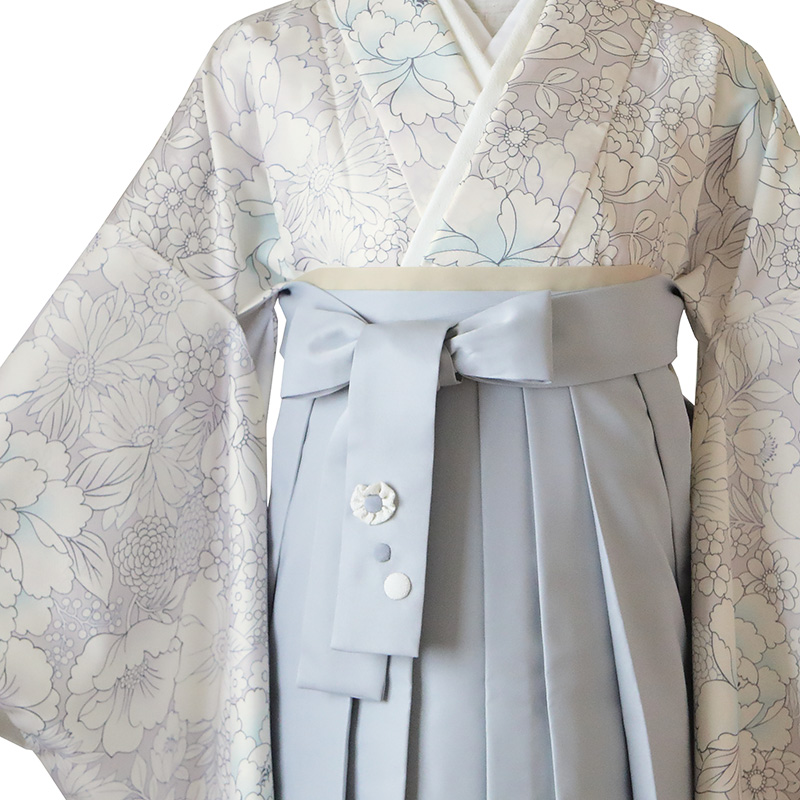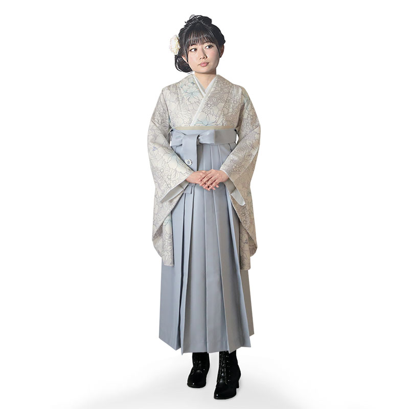 女の子の卒業式のお祝いにぴったりのレンタル着物と袴セットです。トレンド感のあるデザインでグレー花柄のお着物となります。